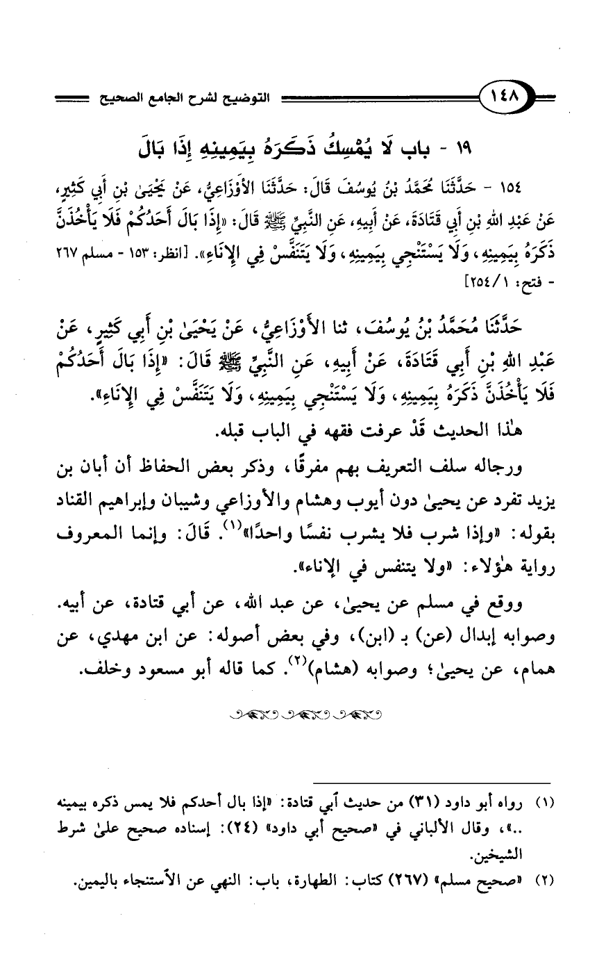 154 - حَدَّثَنَا مُحَمَّدُ بْنُ يُوسُفَ قَالَ: حَدَّثَنَا الأَوْزَاعِيُّ، عَنْ يَحْيَى بْنِ أَبِي كَثِيرٍ، عَنْ عَبْدِ اللهِ بْنِ أَبِي قَتَادَةَ، عَنْ أبِيهِ، عَنِ النَّبِيِّ - صلى الله عليه وسلم - قَالَ: "إِذّا بَالَ أَحَدُكُمْ فَلَا يَأْخُذَنَّ ذَكَرَهُ بِيَمِينِهِ، وَلَا يَسْتَنْجِي بِيَمِينِهِ، وَلَا يَتَنَفَّسْ فِي الانَاءِ". [انظر: 153 - مسلم 267 - فتح: 1/ 254]