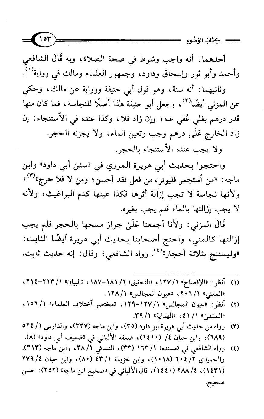 وثانيهما: أنه سنة، وهو قول أبي حنيفة ورواية عن مالك، وحكي عن المزني أيضًا (¬2)، وجعل أبو حنيفة هذا أصلًا للنجاسة، فما كان منها قدر درهم بغلي عُفي عنه؛ وإن زاد فلا، وكذا عنده في الاستنجاء: إن زاد الخارج عَلَى درهم وجب وتعين الماء، ولا يجزئه الحجر.