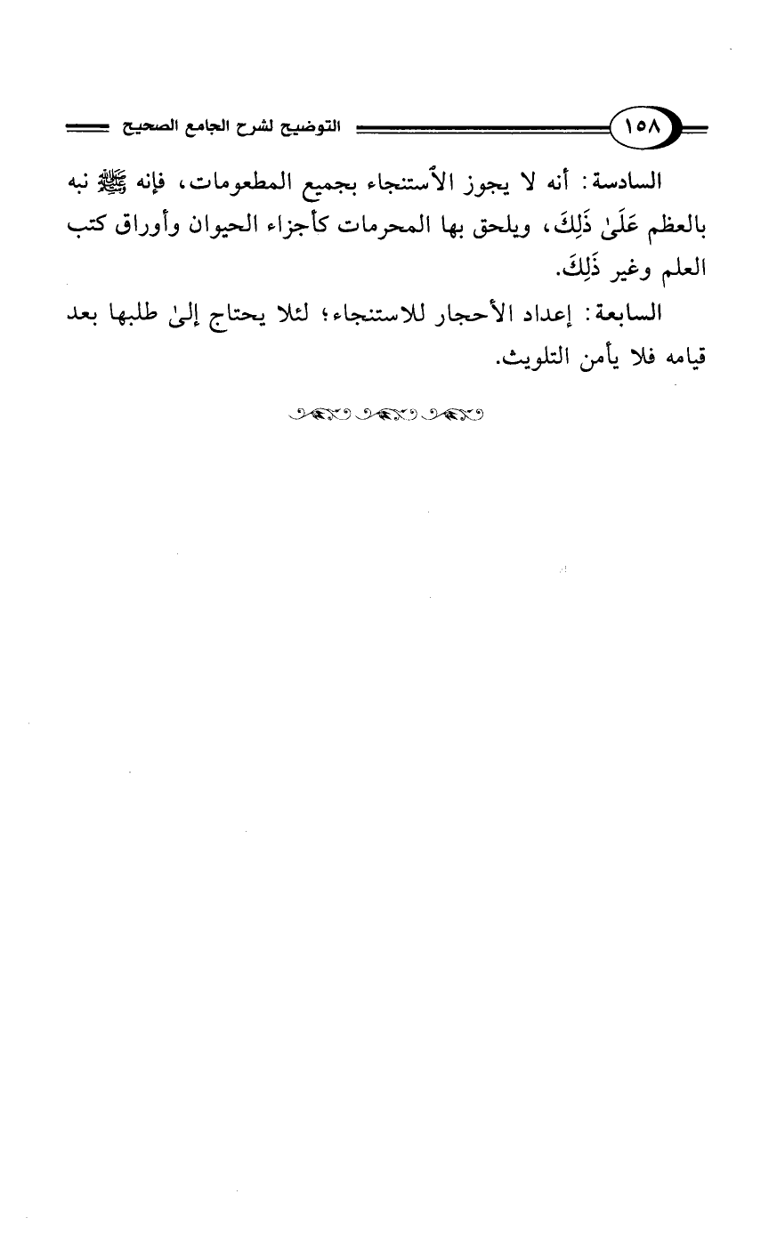 السادسة: أنه لا يجوز الاستنجاء بجميع المطعومات، فإنه - صلى الله عليه وسلم - نبه بالعظم عَلَى ذَلِكَ، ويلحق بها المحرمات كأجزاء الحيوان وأوراق كتب العلم وغير ذَلِكَ.