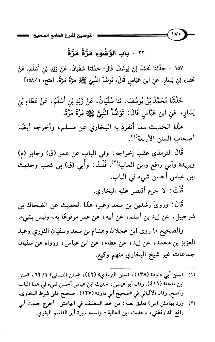 157 - حَدَّثَنَا مُحَمَّد بْنُ يُوسُفَ قَالَ: حَدَّثَنَا سُفْيَانُ، عَنْ زَيْدِ بْنِ أَسْلَمَ، عَنْ عَطًاءِ بْنِ يَسَارٍ، عَنِ ابن عَبَّاسٍ قَالَ: تَوَضَّأَ النَّبِيُّ - صلى الله عليه وسلم - مَرَّةً مَرَّةً. [فتح:1/ 258]
