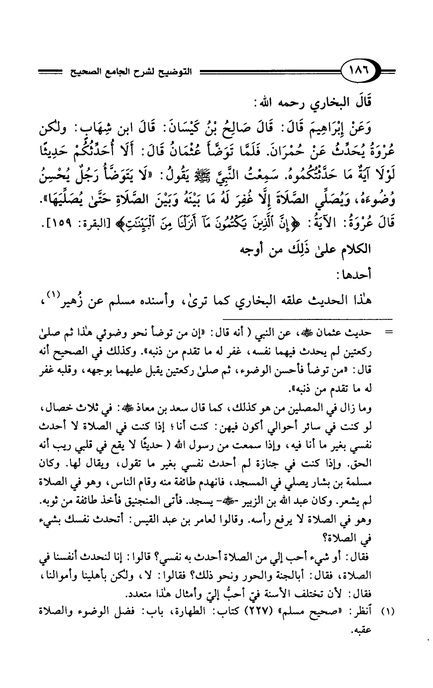 وَعَنْ إِبْرَاهِيمَ قَالَ: قَالَ صَالِحُ بْنُ كَيْسَانَ: قَالَ ابن شِهَابٍ: ولكن عُرْوَةُ يُحَدِّثُ عَنْ حُمْرَانَ. فَلَمَّا تَوَضَّأَ عُثْمَانُ قَالَ: أَلَا أُحَدِّثُكُمْ حَدِيثًا لَوْلَا آيَةٌ مَا حَدَّثْتُكُمُوهُ. سَمِعْتُ النَّبيَّ - صلى الله عليه وسلم - يَقُولُ: "لَا يَتَوَضَّأُ رَجُلٌ يُحْسِنُ وُضُوءَهُ، وَيُصَلِّي الصَّلَاةَ إِلَّا غُفِرَ لَهُ مَا بَيْنَهُ وَبَيْنَ الصَّلَاةِ حَتَّى يُصَلِّيَهَا". قَالَ عُرْوَةُ: الآيَةُ: {إِنَّ الَّذِينَ يَكْتُمُونَ مَا أَنْزَلْنَا مِنَ الْبَيِّنَاتِ} [البقرة: 159].