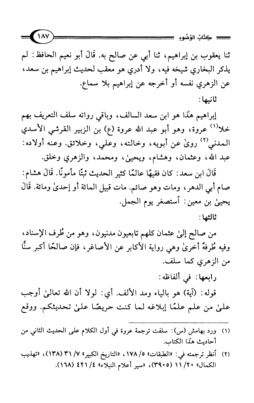 إبراهيم هذا هو ابن سعد السالف، وباقي رواته سلف التعريف بهم خلا (¬1) عروة، وهو أبو عبد الله عروة (ع) بن الزبير القرشي الأسدي المدني (¬2) روى عن أبويه، وخالته، وعلي، وخلائق. وعنه أولاده: عبد الله، وعثمان، وهشام، ويحيى، ومحمد، والزهري وخلق.