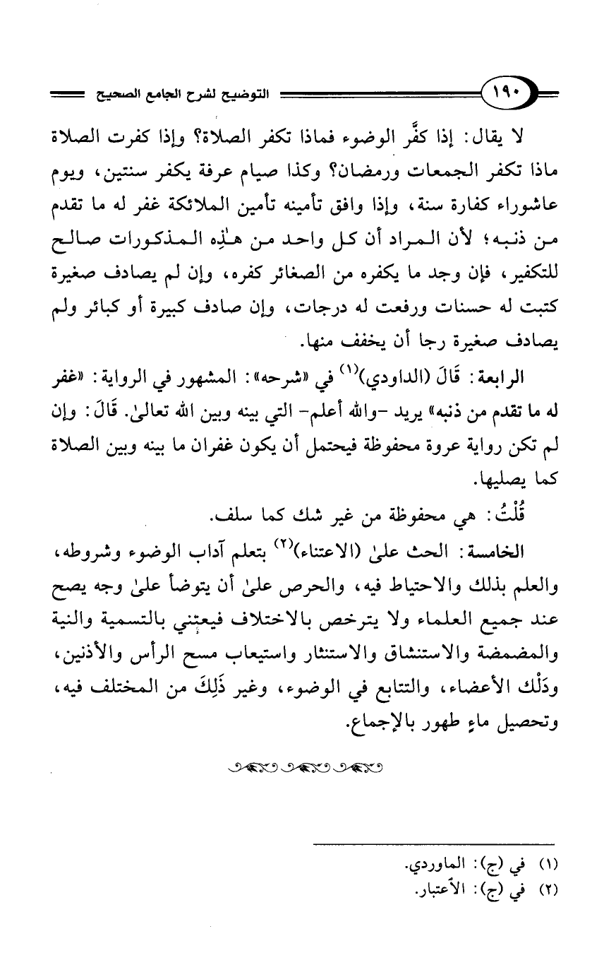 لا يقال: إذا كفَّر الوضوء فماذا تكفر الصلاة؟ وإذا كفرت الصلاة ماذا تكفر الجمعات ورمضان؟ وكذا صيام عرفة يكفر سنتين، ويوم عاشوراء كفارة سنة، وإذا وافق تأمينه تأمين الملائكة غفر له ما تقدم من ذنبه؛ لأن المراد أن كل واحد من هذِه المذكورات صالح للتكفير، فإن وجد ما يكفره من الصغائر كفره، وإن لم يصادف صغيرة كتبت له حسنات ورفعت له درجات، وإن صادف كبيرة أو كبائر ولم يصادف صغيرة رجا أن يخفف منها.