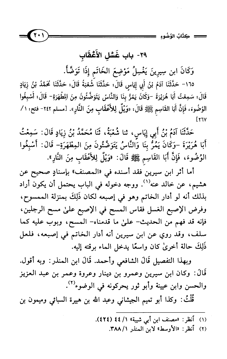 165 - حَدَّثَنَا آدَمُ بْنُ أَبِي إِيَاسِ قَالَ: حَدَّثَنَا شُعْبَةُ قَالَ: حَدَّثَنَا مُحَمَّدُ بْنُ زَيادٍ قَالَ: سَمِعْتُ أَبَا هُرَيْرَةَ -وَكَانَ يَمُرُّ بِنَا وَالنَّاسُ يَتَوَضَّئُونَ مِنَ الِمطْهَرَةِ- قَالَ: أَسْبِغُوا الوُضُوءَ، فَإِنَّ أَبَا القَاسِمِ - صلى الله عليه وسلم - قَالَ: "وَيْلٌ لِلأَعْقَابِ مِنَ النَّارِ". [مسلم 242 - فتح:1/ 267]