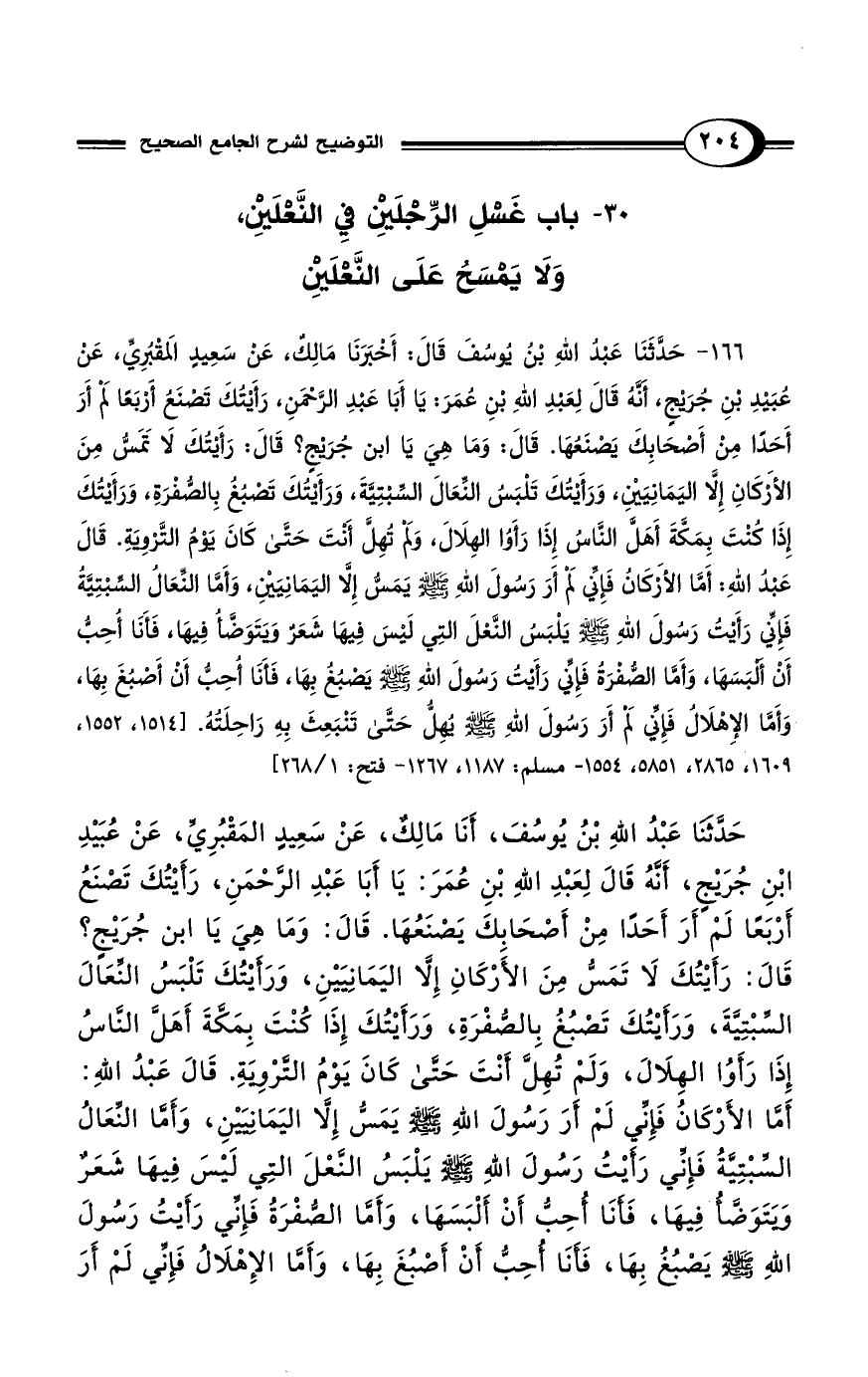 166 - حَدَّثَنَا عَبْدُ اللهِ بْن يُوسُفَ قَالَ: أَخْبَرَنَا مَالِكٌ، عَنْ سَعِيدٍ الَمقْبُرِيِّ، عَنْ عُبَيْدِ بْنِ جُرَيْجٍ، أَنَّهُ قَالَ لِعَبْدِ اللهِ بْنِ عُمَرَ: يَا أَبَا عَبْدِ الرَّحْمَنِ، رَأَيْتُكَ تَصْنَعُ أرْبَعًا لَمْ أَرَ أَحَدًا مِنْ أَصْحَابِكَ يَصْنَعُهَا. قَالَ: وَمَا هِيَ يَا ابن جُرَيْجٍ؟ قَالَ: رَأَيْتُكَ لَا تَمَسُّ مِنَ الأرْكَانِ إِلَّا اليَمَانِيَيْنِ، وَرَأَيْتُكَ تَلْبَسُ النِّعَالَ السِّبْتِيَّةَ، وَرَأَيْتُكَ تَصْبُغُ بِالصُّفْرَةِ، وَرَأَيْتُكَ إِذَا كُنْتَ بِمَكَّةَ أِهَلَّ النَّاسُ إِذَا رَأَوُا الهِلَالَ، وَلَمْ تُهِلَّ أَنْتَ حَتَّى كَانَ يَوْمُ التَّرْوِيةِ. قَالَ عَبْدُ اللهِ: أَمَّا الأرْكَانُ فَإِنّي لَمْ أَرَ رَسُولَ اللهِ - صلى الله عليه وسلم - يَمَسُّ إِلَّا اليَمَانِيَيْنِ، وَأَمَّا النِّعَالُ السِّبْتِيَّهُ فَإِنِّي رَأَيْتُ رَسُولَ اللهِ - صلى الله عليه وسلم - يَلْبَسُ النَّعْلَ التِي لَيْسَ فِيهَا شَعَرٌ وَيَتَوَضَّأُ فِيهَا، فأَنَا أُحِبُّ أَنْ أَلْبَسَهَا، وَأَمَّا الصّفْرَةُ فَإِنِّي رَأَيْتُ رَسُولَ اللهِ - صلى الله عليه وسلم - يَصْبُغُ بِهَا، فأَنَا أُحِبُّ أَنْ أَصْبُغَ بِهَا، وَأَمَّا الإِهْلَالُ فَإِنِّي لَمْ أَرَ رَسُولَ اللهِ - صلى الله عليه وسلم - يُهِلُّ حَتَّى تَنْبَعِثَ بِهِ رَاحِلَتهُ. [1514، 1552، 1609، 2865، 5851، 1554 - مسلم: 1187، 1267 - فتح: 1/ 268]