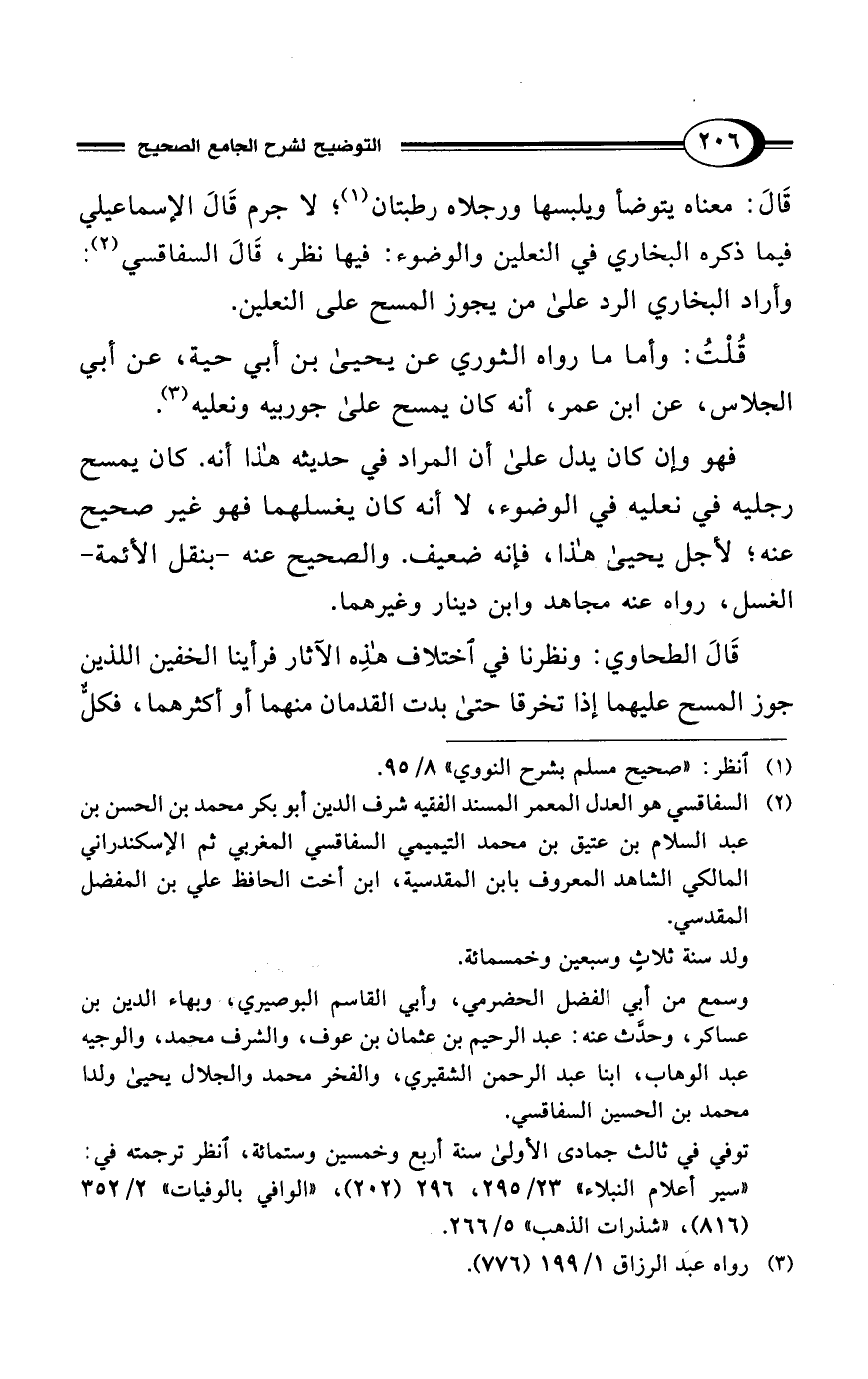 قَالَ: معناه يتوضأ ويلبسها ورجلاه رطبتان (¬1)؛ لا جرم قَالَ الإسماعيلي فيما ذكره البخاري في النعلين والوضوء: فيها نظر، قَالَ السفاقسي (¬2): وأراد البخاري الرد على من يجوز المسح على النعلين.