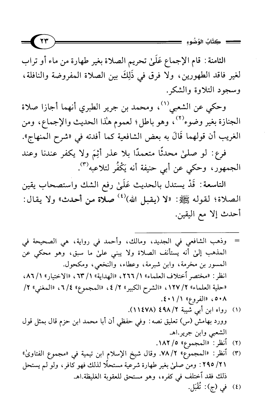 (¬3) انظر: "المجموع" 2/ 78. وقال شيخ الإسلام ابن تيمية في "مجموع الفتاوى" 21/ 295: ومن صلى بغير طهارة شرعية مستحلًا لذلك فهو كافر، ولو لم يستحل ذلك فقد اختلف في كفره، وهو مستحق للعقوبة الغليظة. اهـ.