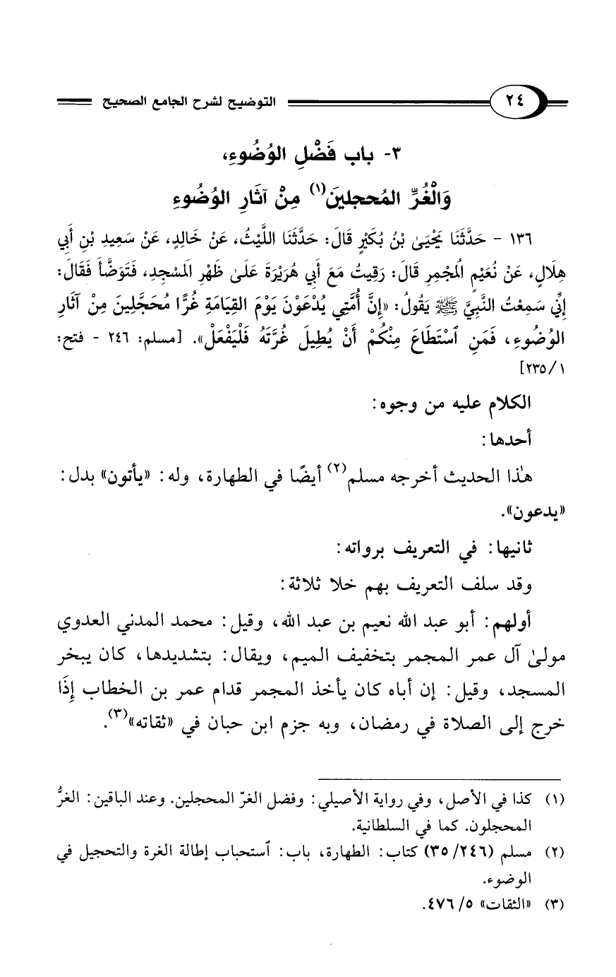 136 - حَدَّثَنَا يَحْيَى بْنُ بُكَيْرٍ قَالَ: حَدَّثَنَا اللَّيْثُ، عَنْ خَالِدٍ، عَنْ سَعِيدِ بْنِ أَبِي هِلَالٍ، عَنْ نُعَيْمٍ الُمجْمِرِ قَالَ: رَقِيتُ مَعَ أَبِي هُرَيْرَةَ عَلَى ظَهْرِ الَمسْجِدِ، فَتَوَضَّأَ فَقَالَ: إِنِّي سَمِعْتُ النَّبِيَّ - صلى الله عليه وسلم - يَقُولُ: "إِنَّ أُمَّتي يُدْعَوْنَ يَوْمَ القِيَامَةِ غُرًّا مُحَجَّلِينَ مِنْ آثَارِ الوُضُوءِ، فَمَنِ اسْتَطَاعَ مِنْكُمْ أَنْ يُطِيلَ غُرَّتَهُ فَلْيَفْعَلْ". [مسلم: 246 - فتح: 1/ 235]