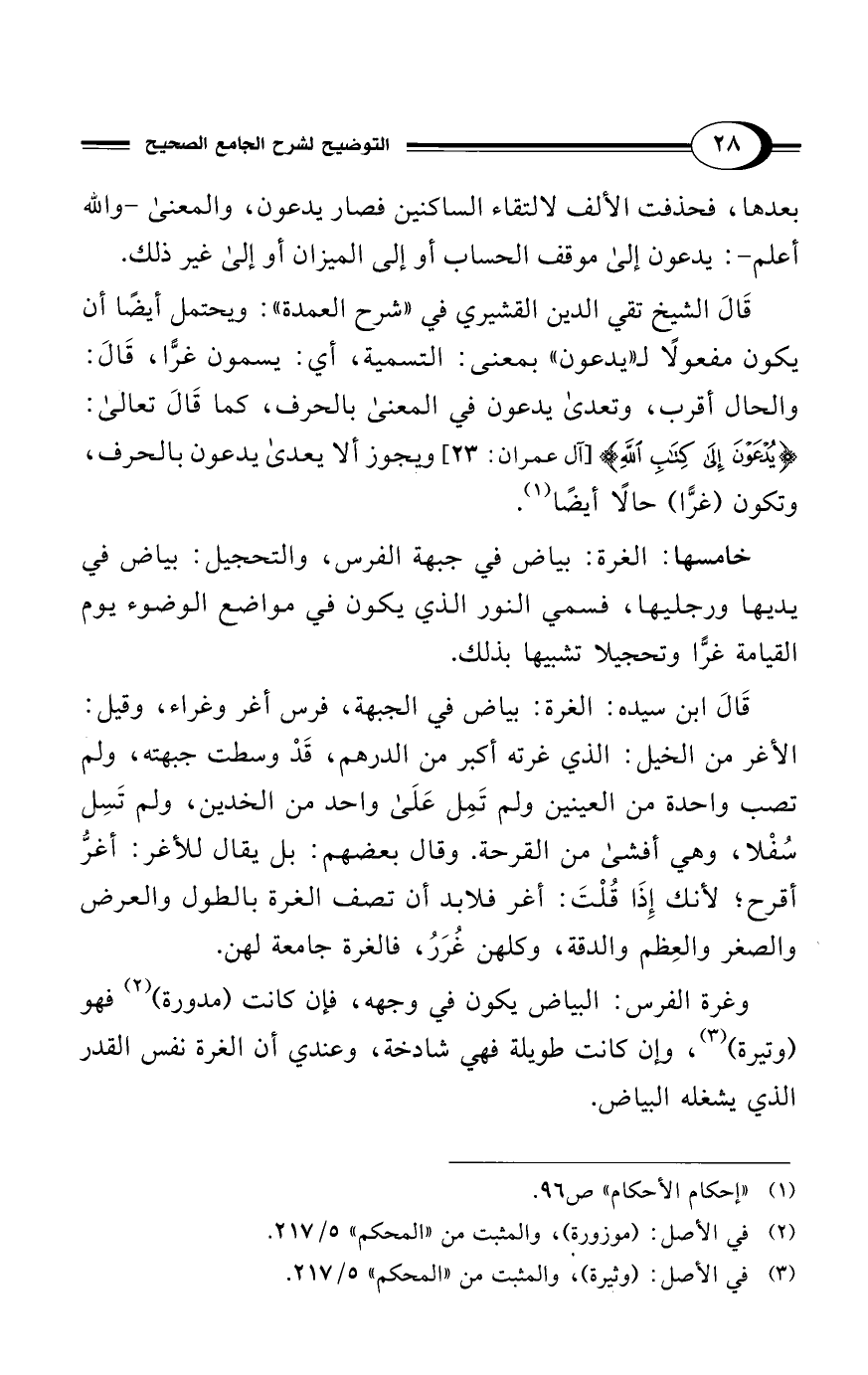 قَالَ الشيخ تقي الدين القشيري في "شرح العمدة": ويحتمل أيضًا أن يكون مفعولًا لـ "يدعون" بمعنى: التسمية، أي: يسمون غرًّا، قَالَ: والحال أقرب، وتعدى يدعون في المعنى بالحرف، كما قَالَ تعالى: {يُدْعَوْنَ إِلَى كِتَابِ اللهِ} [آل عمران: 23] ويجوز ألا يعدى يدعون باالحرف، وتكون (غرًّا) حالًا أيضًا (¬1).