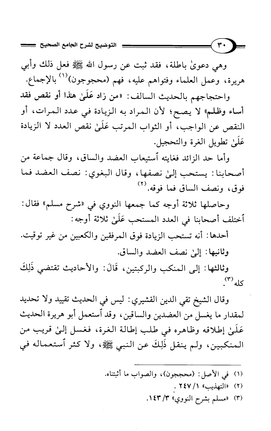 واحتجاجهم بالحديث السالف: "من زاد عَلَى هذا أو نقص فقد أساء وظلم" لا يصح، لأن المراد به الزيادة في عدد المرات، أو النقص عن الواجب، أو الثواب المرتب عَلَى نقص العدد لا الزيادة عَلَى تطويل الغرة والتحجيل.