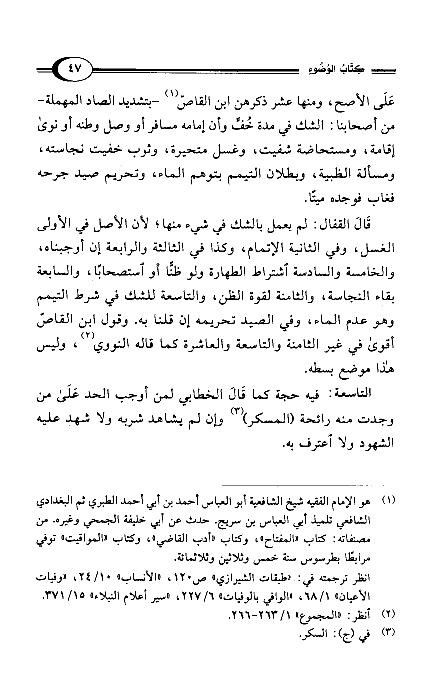 (¬1) هو الإمام الفقيه شيخ الشافعية أبو العباس أحمد بن أبي أحمد الطبري ثم البغدادي الشافعي تلميذ أبي العباس بن سريج. حدث عن أبي خليفة الجمحي وغيره. من مصنفاته: كتاب "المفتاح"، وكتاب "أدب القا ضي"، وكتاب "المواقيت" توفي مرابطًا بطرسوس سنة خمس وثلاثين وثلاثمائة.
