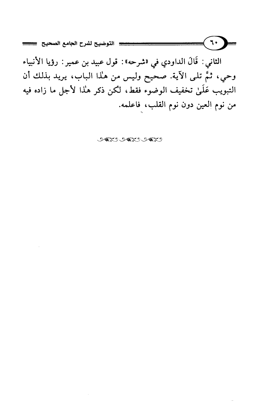 الثاني: قَالَ الداودي في "شرحه": قول عبيد بن عمير: رؤيا الأنبياء وحي، ثمَّ تلى الآية. صحيح وليس من هذا الباب، يريد بذلك أن التبويب عَلَى تخفيف الوضوء فقط، لكن ذكر هذا لأجل ما زاده فيه من نوم العين دون نوم القلب، فاعلمه.