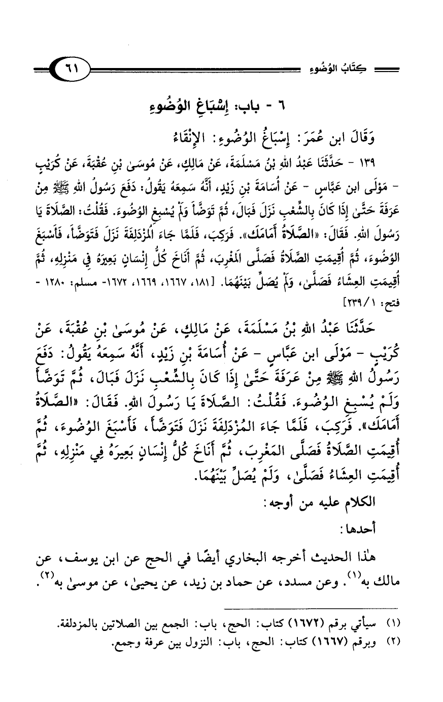 139 - حَدَّثَنَا عَبْدُ اللهِ بْنُ مَسلَمَةَ، عَنْ مَالِكٍ، عَنْ مُوسَى بْنِ عُقْبَةَ، عَنْ كُرَيْبٍ -مَوْلَى ابن عَبَّاسٍ- عَنْ أُسَامَةَ بْنِ زَيدٍ، أَنَّهُ سَمِعَهُ يَقُولُ: دَفَعَ رَسُولُ اللهِ - صلى الله عليه وسلم - مِنْ عَرَفَةَ حَتَّى إِذَا كَانَ بِالشِّعْبِ نَزَلَ فَبَالَ، ثُمَّ تَوَضَّأ وَلم يُسبغِ الوُضُوءَ. فَقُلْتُ: الصَّلَاةَ يَا رَسُولَ اللهِ. فَقَالَ: "الصَّلَاةُ أَمَامَكَ". فَرَكِبَ، فَلَمَّا جَاءَ الُمزْدَلِفَةَ نَزَلَ فَتَوَضَّأ، فَأَسْبَغَ الوُضُوءَ، ثُمَّ أُقِيمَتِ الصَّلَاةُ فَصَلَّى الَمغْرِبَ، ثُمُّ أَنَاخَ كُلُّ إِنْسَانٍ بَعِيرَهُ فِي مَنْزِلهِ، ثمَّ أُقِيمَتِ العِشَاءُ فَصَلَّى، وَلَمْ يُصَلِّ بَيْنَهُمَا. [181، 1667، 1669، 1672 - مسلم: 1280 - فتح: 1/ 239]
