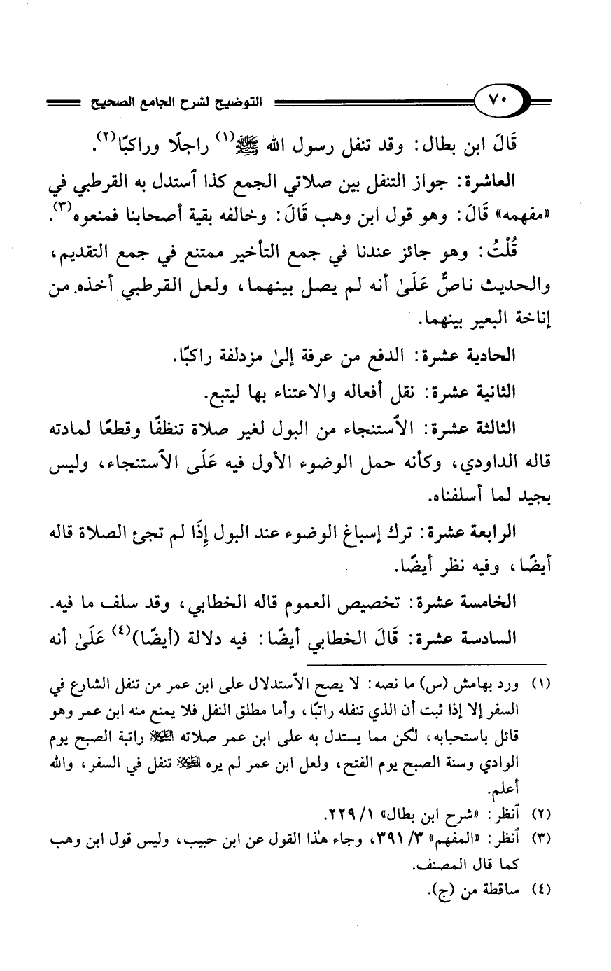 العاشرة: جواز التنفل بين صلاتي الجمع كذا استدل به القرطبي في "مفهمه" قَالَ: وهو قول ابن وهب قَالَ: وخالفه بقية أصحابنا فمنعوه (¬3).