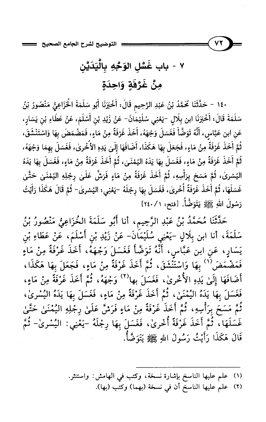 140 - حَدَّثَنَا مُحَمَّدُ بْنُ عَبْدِ الرَّحِيمِ قَالَ: أَخْبَرَنَا أَبُو سَلَمَةَ الُخزَاعِيُّ مَنصُورُ بْنُ سَلَمَةَ قَالَ: أَخْبَرَنَا ابن بِلَالٍ -يَعْنِي سُلَيْمَانَ- عَنْ زَيْدِ بْنِ أَسْلَمَ، عَنْ عَطَاءِ بْنِ يَسَارٍ، عَنِ ابن عَبَّاسِ، أَنَّهُ تَوَضَّأَ فَغَسَلَ وَجْهَهُ، أَخَذَ غَرفَةً مِنْ مَاءٍ، فَمَضْمَضَ بِهَا وَاسْتَنْشَقَ، ثُمَّ أَخَذَ غَرْفَةً مِنْ مَاءٍ، فَجَعَلَ بِهَا هَكَذَا، أَضَافَهَا إِلَى يَدِهِ الأُخْرى، فَغَسَلَ بِهِمَا وَجْهَهُ، ثُمَّ أَخَذَ غَرْفَة مِنْ مَاءٍ، فَغَسَلَ بِهَا يَدَهُ اليُمْنَى، ثُمَّ أَخَذَ غَرْفَةً مِنْ مَاءٍ، فَغَسَلَ بِهَا يَدَهُ اليُسْرى، ثُمَّ مَسَحَ بِرَأْسِهِ، ثُمَّ أَخَذَ غَرْفَةً مِنْ مَاءٍ فَرَشَّ عَلَى رِجْلِهِ اليُمْنَى حَتَّى غَسَلَهَا، ثُمَّ أَخَذَ غَرفَةً أُخْرى، فَغَسَلَ بِهَا رِجْلَهُ -يَعْنِي: اليُسْرى- قَالَ هَكَذَا رَأَيْتُ رَسُولَ اللهِ - صلى الله عليه وسلم - يتَوَضّأُ. [فتح 1/ 240]