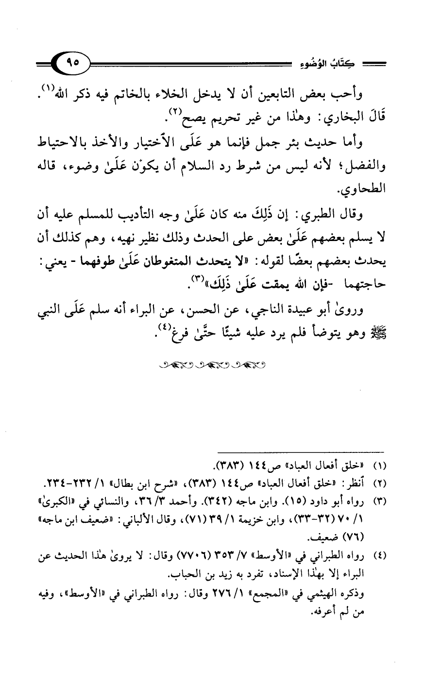 وقال الطبري: إن ذَلِكَ منه كان على وجه التأديب للمسلم عليه أن لا يسلم بعضهم عَلَى بعض على الحدث وذلك نظير نهيه، وهم كذلك أن يحدث بعضهم بعضًا لقوله: "لا يتحدث المتغوطان عَلَى طوفهما -يعني: حاجتهما- فإن الله يمقت عَلَى ذَلِكَ" (¬3).
