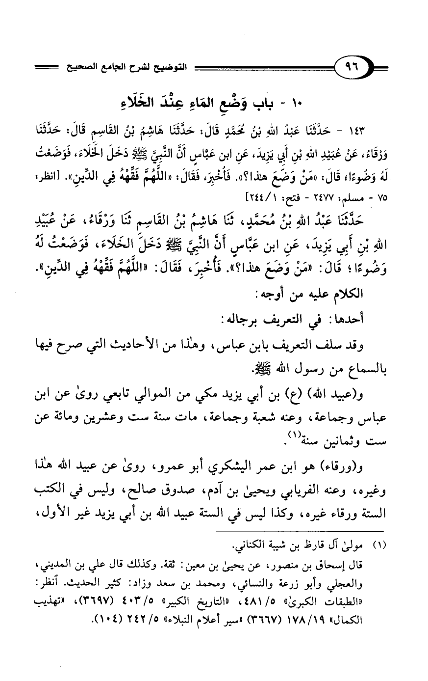 143 - حَدَّثَنَا عَبْدُ اللهِ بْنُ محمد قَالَ: حَدَّثَنَا هَاشِمُ بْنُ القَاسِمِ قَالَ: حَدَّثَنَا وَرْقَاءُ، عَنْ عُبَيدِ اللهِ بنِ أَبى يَزِيدَ، عَنِ ابن عَبَّاسٍ أَنَّ النَّبِيَّ - صلى الله عليه وسلم -دخَلَ الَخلَاءَ، فَوَضَعتُ لَهُ وَضُوءًا، قَالَ: "مَنْ وَضَعَ هذا؟ ". فَأُخْبِرَ، فَقَالَ: "اللَّهُمَّ فَقِّهْهُ فِي الدِّينِ". [انظر: 75 - مسلم: 2477 - فتح: 1/ 244]