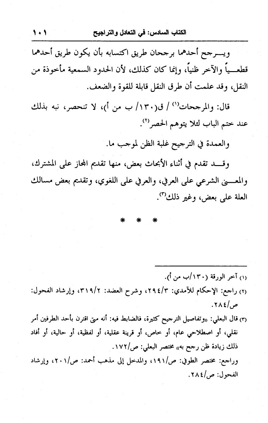 (٣) قال البعلي: "وتفاصيل الترجيح كثيرة، فالضابط فيه: أنه متى اقترن بأحد الطرفين أمر نقلي، أو اصطلاحي عام، أو خاص، أو قرينة عقلية، أو لفظية، أو حالية، أو أفاد ذلك زيادة ظن رجح به" مختصر البعلي: ص/ ١٧٢.