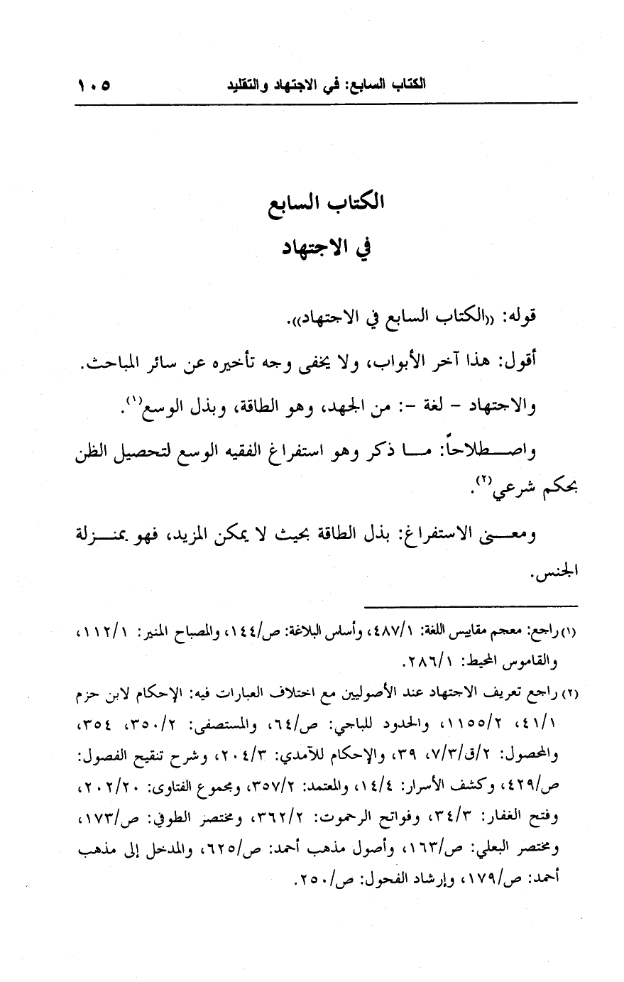 (٢) راجع تعريف الاجتهاد عند الأصوليين مع اختلاف العبارات فيه: الإحكام لابن حزم ١/ ٤١، ٢/ ١١٥٥، والحدود للباجي: ص/ ٦٤، والمستصفى: ٢/ ٣٥٠، ٣٥٤، والمحصول: ٢/ ق/ ٣/ ٧، ٣٩، والإحكام للآمدي: ٣/ ٢٠٤، وشرح تنقيح الفصول: ص/ ٤٢٩، وكشف الأسرار: ٤/ ١٤، والمعتمد: ٢/ ٣٥٧، ومجموع الفتاوى: ٢٠/ ٢٠٢، وفتح الغفار: ٣/ ٣٤، وفواتح الرحموت: ٢/ ٣٦٢، ومختصر الطوفي: ص/ ١٧٣، ومختصر البعلي: ص/ ١٦٣، وأصول مذهب أحمد: ص/ ٦٢٥، والمدخل إلى مذهب أحمد: ص/ ١٧٩، وإرشاد الفحول: ص/ ٢٥٠.