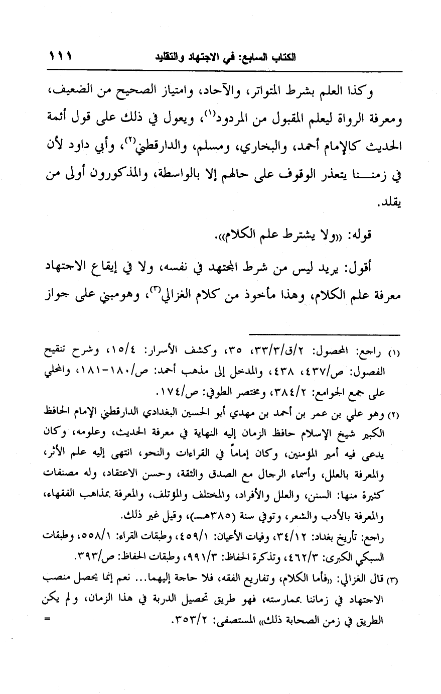 وكذا العلم بشرط المتواتر، والآحاد، وامتياز الصحيح من الضعيف، ومعرفة الرواة ليعلم المقبول من المردود (١)، ويعول في ذلك على قول أئمة الحديث كالإمام أحمد، والبخاري، ومسلم، والدارقطني (٢)، وأبي داود لأن في زمننا يتعذر الوقوف على حالهم إلا بالواسطة، والمذكورون أولى من يقلد.