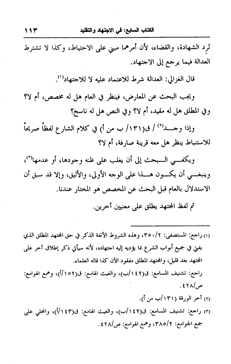 (١) راجع: المستصفى: ٢/ ٣٥٠، وهذه الشروط الآنفة الذكر في حق المجتهد المطلق الذي يفتي في جميع أبواب الشرع بما يؤديه إليه اجتهاده، لأنه سيأتي ذكر إطلاق آخر على المجتهد بعد قليل، والمجتهد المطلق مفقود الآن كذا قاله العلماء.
