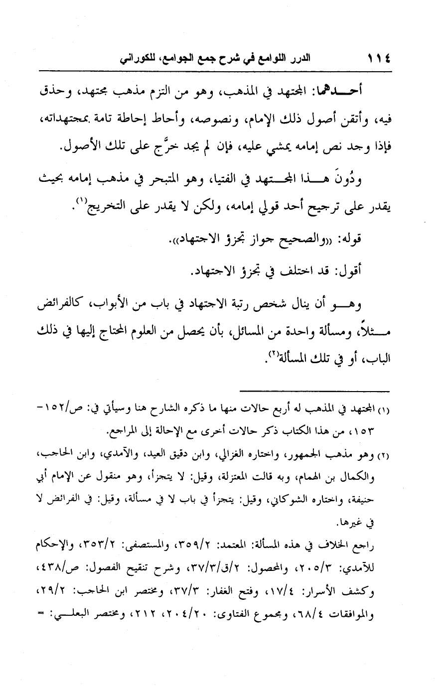 (٢) وهو مذهب الجمهور، واختاره الغزالي، وابن دقيق العيد، والآمدي، وابن الحاجب، والكمال بن الهمام، وبه قالت المعتزلة، وقيل: لا يتجزأ، وهو منقول عن الإمام أبي حنيفة، واختاره الشوكاني، وقيل: يتجزأ في باب لا في مسألة، وقيل: في الفرائض لا في غيرها.
