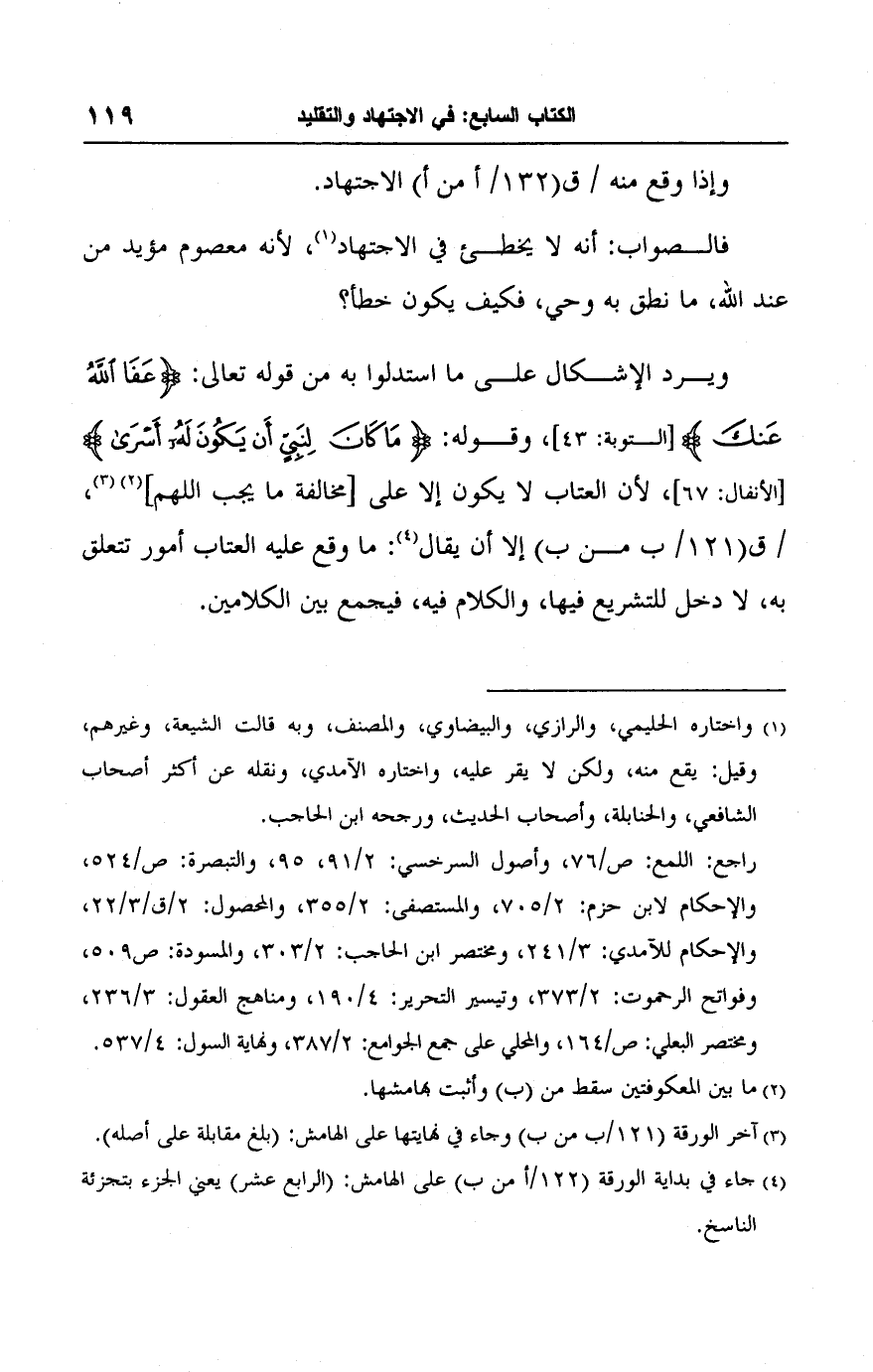 ويرد الإشكال على ما استدلوا به من قوله تعالى: {عَفَا اللَّهُ عَنْكَ} [التوبة: ٤٣]، وقوله: {مَا كَانَ لِنَبِيٍّ أَنْ يَكُونَ لَهُ أَسْرَى} [الأنفال: ٦٧]، لأن العتاب لا يكون إلا على [مخالفة ما يجب اللهم] (٢) (٣)، إلا أن يقال (٤): ما وقع عليه العتاب أمور تتعلق به، لا دخل للتشريع فيها، والكلام فيه، فيجمع بين الكلامين.