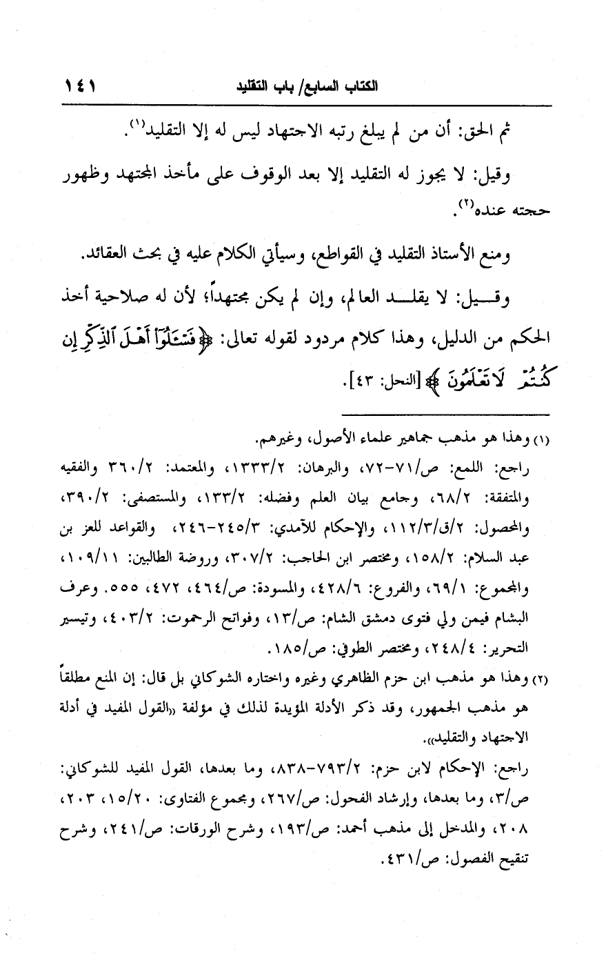 راجع: اللمع: ص/ ٧١ - ٧٢، والبرهان: ٢/ ١٣٣٣، والمعتمد: ٢/ ٣٦٠ والفقيه والمتفقه: ٢/ ٦٨، وجامع بيان العلم وفضله: ٢/ ١٣٣، والمستصفى: ٢/ ٣٩٠، والمحصول: ٢/ ق/ ٣/ ١١٢، والإحكام للآمدي: ٣/ ٢٤٥ - ٢٤٦، والقواعد للعز بن عبد السلام: ٢/ ١٥٨، ومختصر ابن الحاجب: ٢/ ٣٠٧، وروضة الطالبين: ١١/ ١٠٩، والمجموع: ١/ ٦٩، والفروع: ٦/ ٤٢٨، والمسودة: ص/ ٤٦٤، ٤٧٢، ٥٥٥. وعرف البشام فيمن ولي فتوى دمشق الشام: ص/ ١٣، وفواتح الرحموت: ٢/ ٤٠٣، وتيسير التحرير: ٤/ ٢٤٨، ومختصر الطوفي: ص/ ١٨٥.