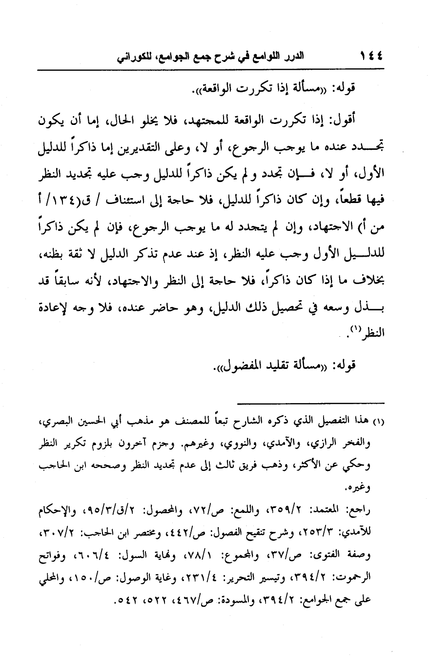 أقول: إذا تكررت الواقعة للمجتهد، فلا يخلو الحال، إما أن يكون تجدد عنده ما يوجب الرجوع، أو لا، وعلى التقديرين إما ذاكرًا للدليل الأول، أو لا، فإن تجدد ولم يكن ذاكرًا للدليل وجب عليه تجديد النظر فيها قطعًا، وإن كان ذاكرًا للدليل، فلا حاجة إلى استئناف الاجتهاد، وإن لم يتجدد له ما يوجب الرجوع، فإن لم يكن ذاكرًا للدليل الأول وجب عليه النظر، إذ عند عدم تذكر الدليل لا ثقة بظنه، بخلاف ما إذا كان ذاكرًا، فلا حاجة إلى النظر والاجتهاد، لأنه سابقًا قد بذل وسعه في تحصيل ذلك الدليل، وهو حاضر عنده، فلا وجه لإعادة النظر (١).