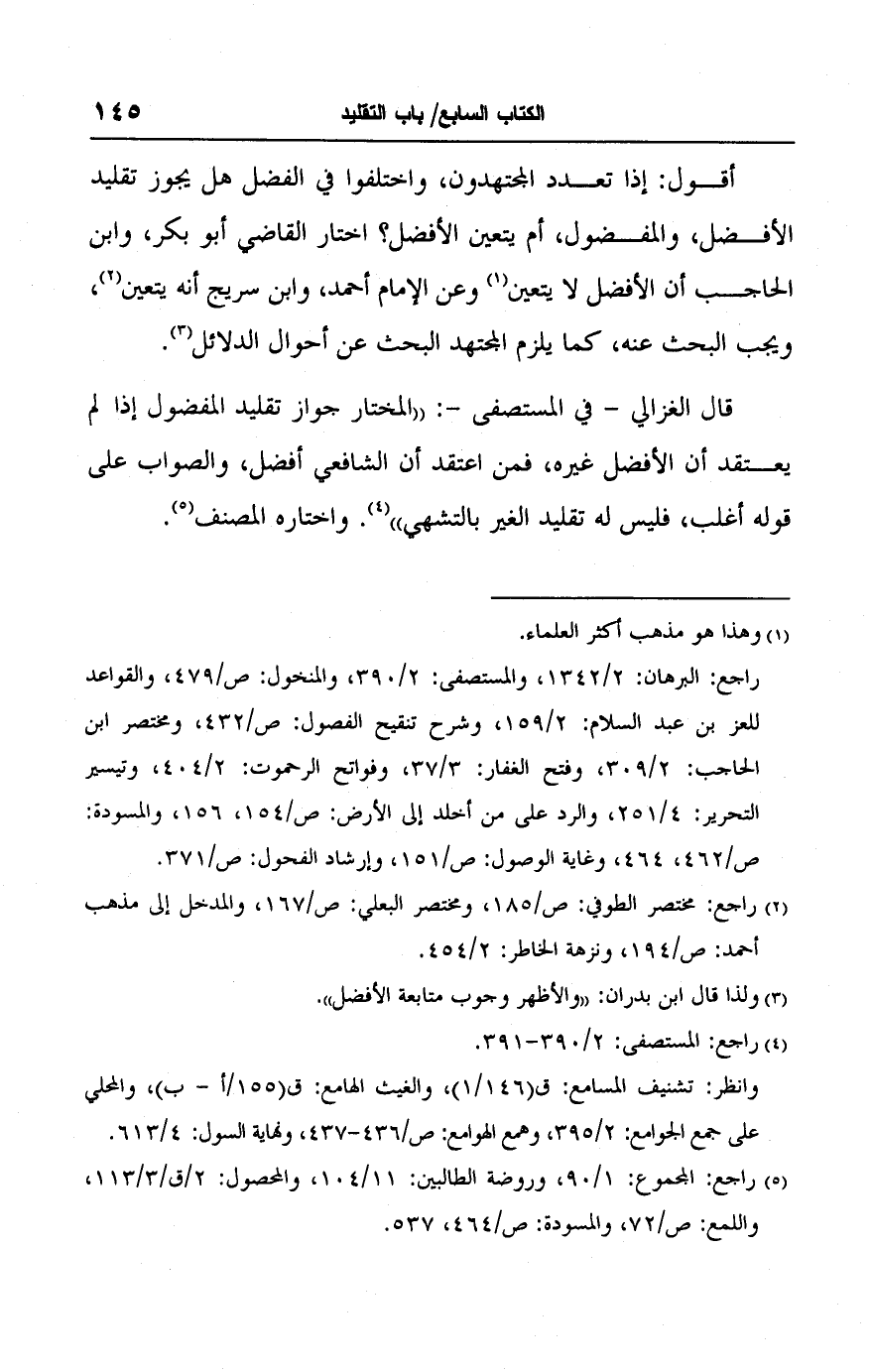 (٥) راجع: المجموع: ١/ ٩٠، وروضة الطالبين: ١١/ ١٠٤، والمحصول: ٢/ ق/ ٣/ ١١٣، واللمع: ص/ ٧٢، والمسودة: ص/ ٤٦٤، ٥٣٧.