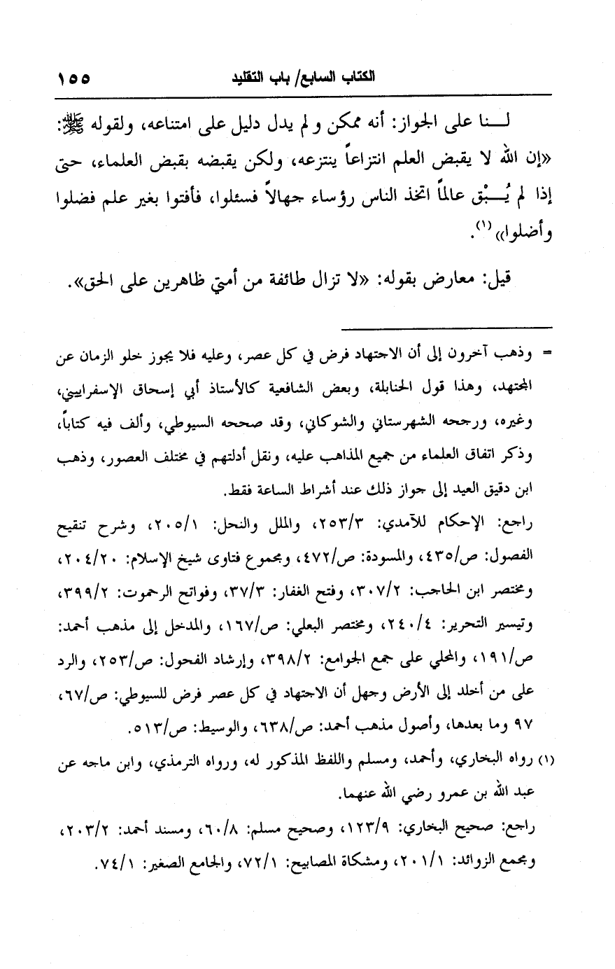 = وذهب آخرون إلى أن الاجتهاد فرض في كل عصر، وعليه فلا يجوز خلو الزمان عن المجتهد، وهذا قول الحنابلة، وبعض الشافعية كالأستاذ أبي إسحاق الإسفراييني، وغيره، ورجحه الشهرستاني والشوكاني، وقد صححه السيوطي، وألف فيه كتابًا، وذكر اتفاق العلماء من جميع المذاهب عليه، ونقل أدلتهم في مختلف العصور، وذهب ابن دقيق العيد إلى جواز ذلك عند أشراط الساعة فقط.
