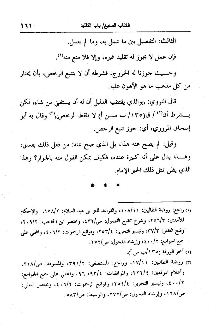 (١) راجع: روضة الطالبين: ١١/ ١٠٨، والقواعد للعز بن عبد السلام: ٢/ ١٥٨، والإحكام للآمدي: ٣/ ٢٥٦، وشرح تنقيح الفصول: ص/ ٤٣٢، ومختصر ابن الحاحب: ٢/ ٢٠٩، وفتح الغفار: ٣/ ٣٧، وتيسير التحرير: ٤/ ٢٥٣، وفواتح الرحموت: ٢/ ٤٠٦، والمحلي على جمع الجوامع: ٢/ ٤٠٠، وارشاد الفحول: ص/ ٢٧٢.