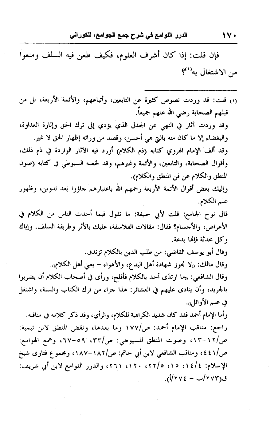 راجع: مناقب الإمام أحمد: ص/ ١٧٧ وما بعدها، ونقض المنطق لابن تيمية: ص/ ١٢ - ١٣، وصوت المنطق للسيوطي: ص/ ٣٣، ٥٩ - ٦٧، وهمع الهوامع: ص/ ٤٤١، ومناقب الشافعي لابن أبي حاتم: ص/ ١٨٢ - ١٨٧، ومجموع فتاوى شيخ الإسلام: ٤/ ١٤، ١٥، ٥/ ٢٢، ١٢٠، ٢٦١، والدرر اللوامع لابن أبي شريف: ق (٢٧٣/ ب - ٢٧٤/ أ).