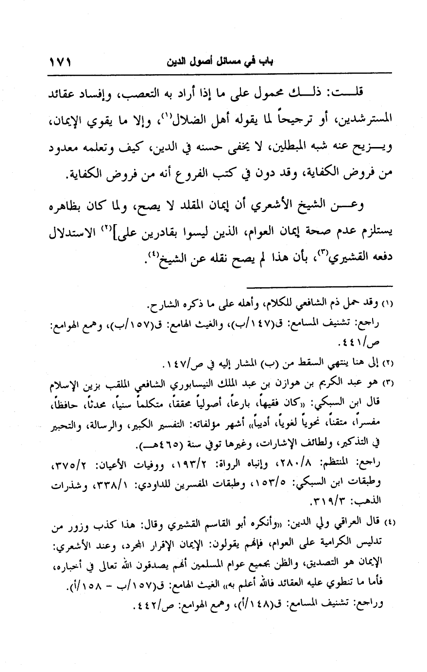 (٤) قال العراقي ولي الدين: "وأنكره أبو القاسم القشيري وقال: هذا كذب وزور من تدليس الكرامية على العوام، فإنهم يقولون: الإيمان الإقرار المجرد، وعند الأشعري: الإيمان هو التصديق، والظن بحميع عوام المسلمين أنهم يصدقون اللَّه تعالى في أخباره، فأما ما تنطوي عليه العقائد فاللَّه أعلم به" الغيث الهامع: ق (١٥٧/ ب - ١٥٨/ أ).