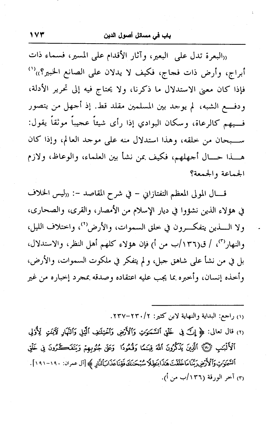 قال المولى المعظم التفتازاني -في شرح المقاصد-: "ليس الخلاف في هؤلاء الذين نشؤوا في ديار الإسلام من الأمصار، والقرى، والصحارى، ولا الذين يتفكرون في خلق السموات، والأرض (٢)، واختلاف الليل، والنهار (٣)، فإن هؤلاء كلهم أهل النظر، والاستدلال، بل في من نشأ على شاهق جبل، ولم يتفكر في ملكوت السموات، والأرض، وأخذه إنسان، وأخبره بما يجب عليه اعتقاده وصدقه بمجرد إخباره من غير