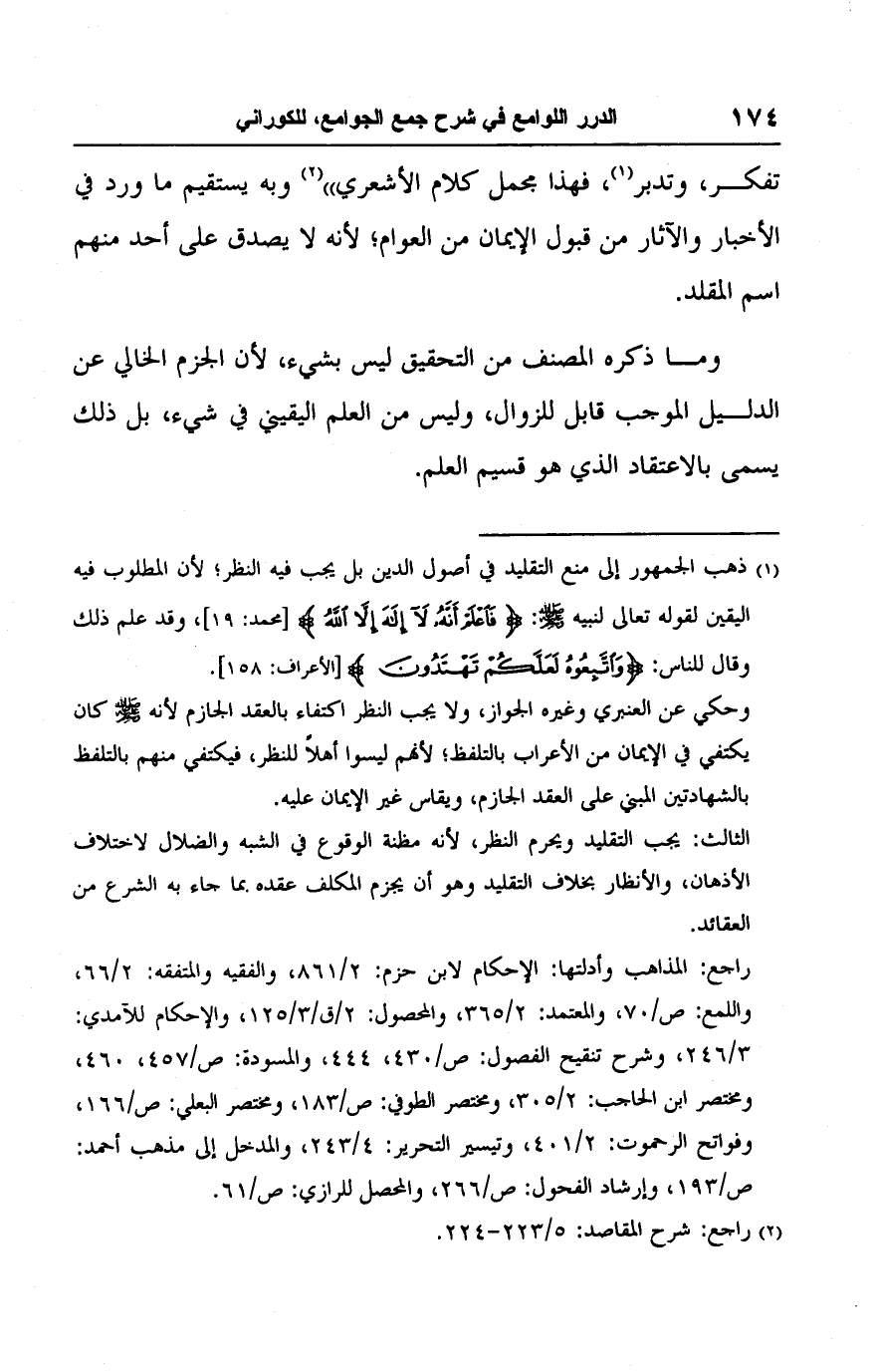 (١) ذهب الجمهور إلي منع التقليد في أصول الدين بل يجب فيه النظر؛ لأن المطلوب فيه اليقين لقوله تعالى لنبيه -صلى اللَّه عليه وسلم-: {فَاعْلَمْ أَنَّهُ لَا إِلَهَ إِلَّا اللَّهُ} [محمد: ١٩]، وقد علم ذلك وقال للناس: {وَاتَّبِعُوهُ لَعَلَّكُمْ تَهْتَدُونَ} [الأعراف: ١٥٨].