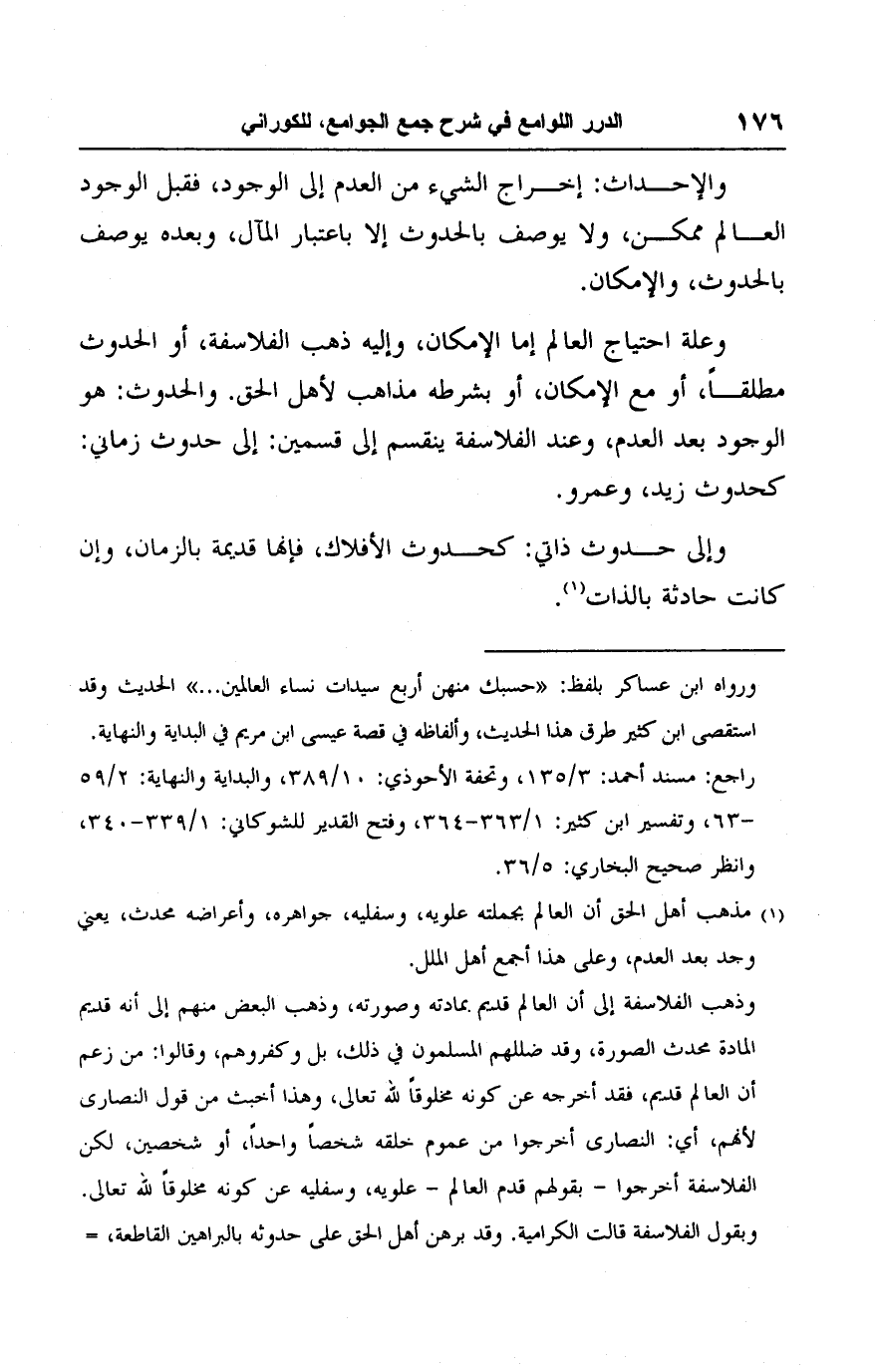 وعلة احتياج العالم إما الإمكان، وإليه ذهب الفلاسفة، أو الحدوث مطلقًا، أو مع الإمكان، أو بشرطه مذاهب لأهل الحق. والحدوث: هو الوجود بعد العدم، وعند الفلاسفة ينقسم إلى قسمين: إلى حدوث زماني: كحدوث زيد، وعمرو.