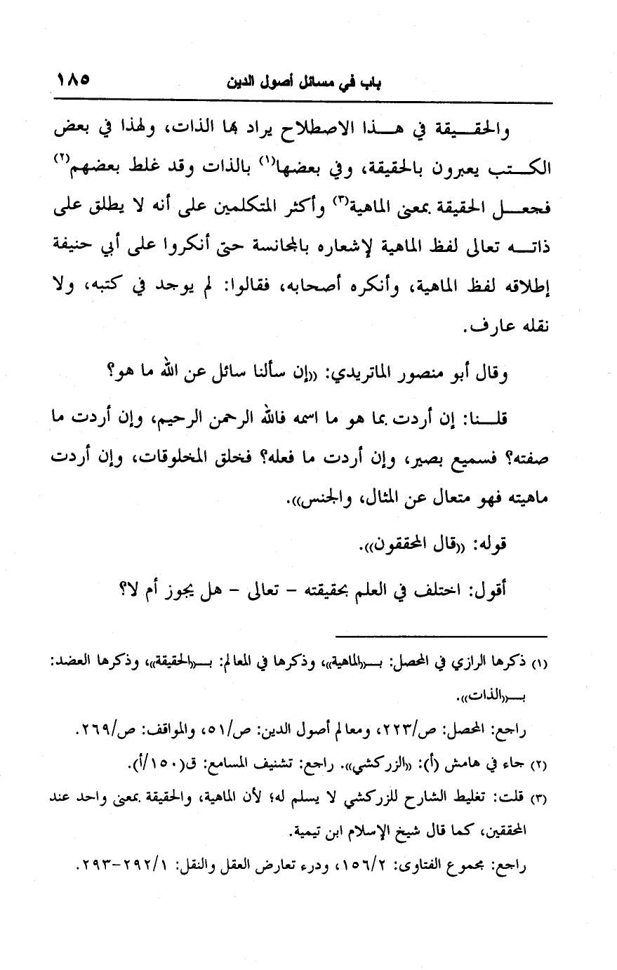 (١) ذكرها الرازي في المحصل: بـ "الماهية"، وذكرها في المعالم: بـ "الحقيقة"، وذكرها العضد: بـ "الذات".