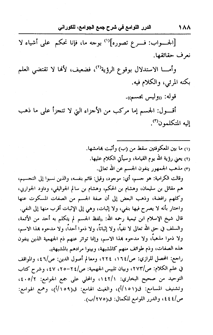 راجع: المحصل للرازي: ص/ ١٦٤، ٢٢٤، ومعالم أصول الدين: ص/ ٤٦، والمواقف في علم الكلام: ص/ ٢٧٣، وبيان تلبيس الجهمية: ص/ ٢٤ - ٢٥، ٤٧، وشرح كتاب التوحيد من صحيح البخاري: ١/ ١٤٢، والمحلي على جمع الجوامع: ٢/ ٤٠٥، وتشنيف المسامع: ق (١٥١/ أ)، والغيث الهامع: ق (١٥٩/ أ)، وهمع الهوامع: ص/ ٤٤٤، والدرر اللوامع للكمال: ق (٢٧٥/ ب).