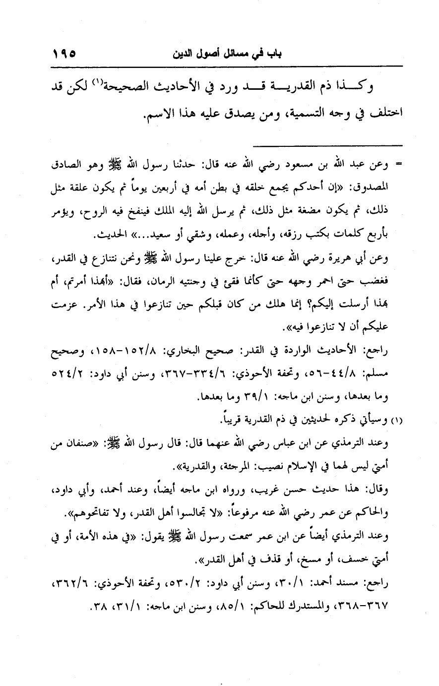راجع: الأحاديث الواردة في القدر: صحيح البخاري: ٨/ ١٥٢ - ١٥٨, وصحيح مسلم: ٨/ ٤٤ - ٥٦، وتحفة الأحوذي: ٦/ ٣٣٤ - ٣٦٧، وسنن أبي داود: ٢/ ٥٢٤ وما بعدها، وسنن ابن ماجه: ١/ ٣٩ وما بعدها.