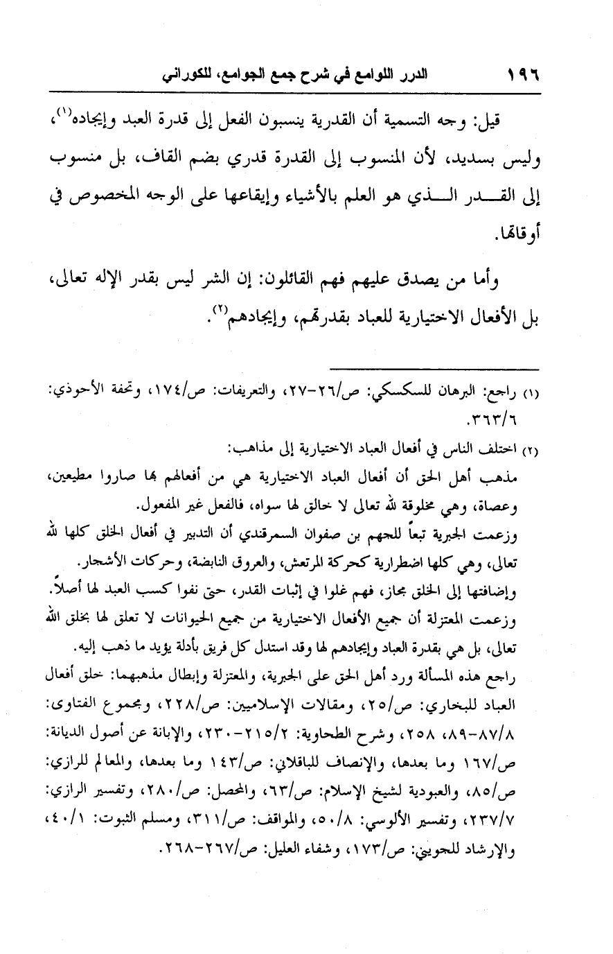 وإضافتها إلى الخلق مجاز، فهم غلوا في إثبات القدر، حتى نفوا كسب العبد لها أصلًا. وزعمت المعتزلة أن جميع الأفعال الاختيارية من جميع الحيوانات لا تعلق لها بخلق اللَّه تعالى، بل هي بقدرة العباد وإيجادهم لها وقد استدل كل فريق بأدلة يؤيد ما ذهب إليه.