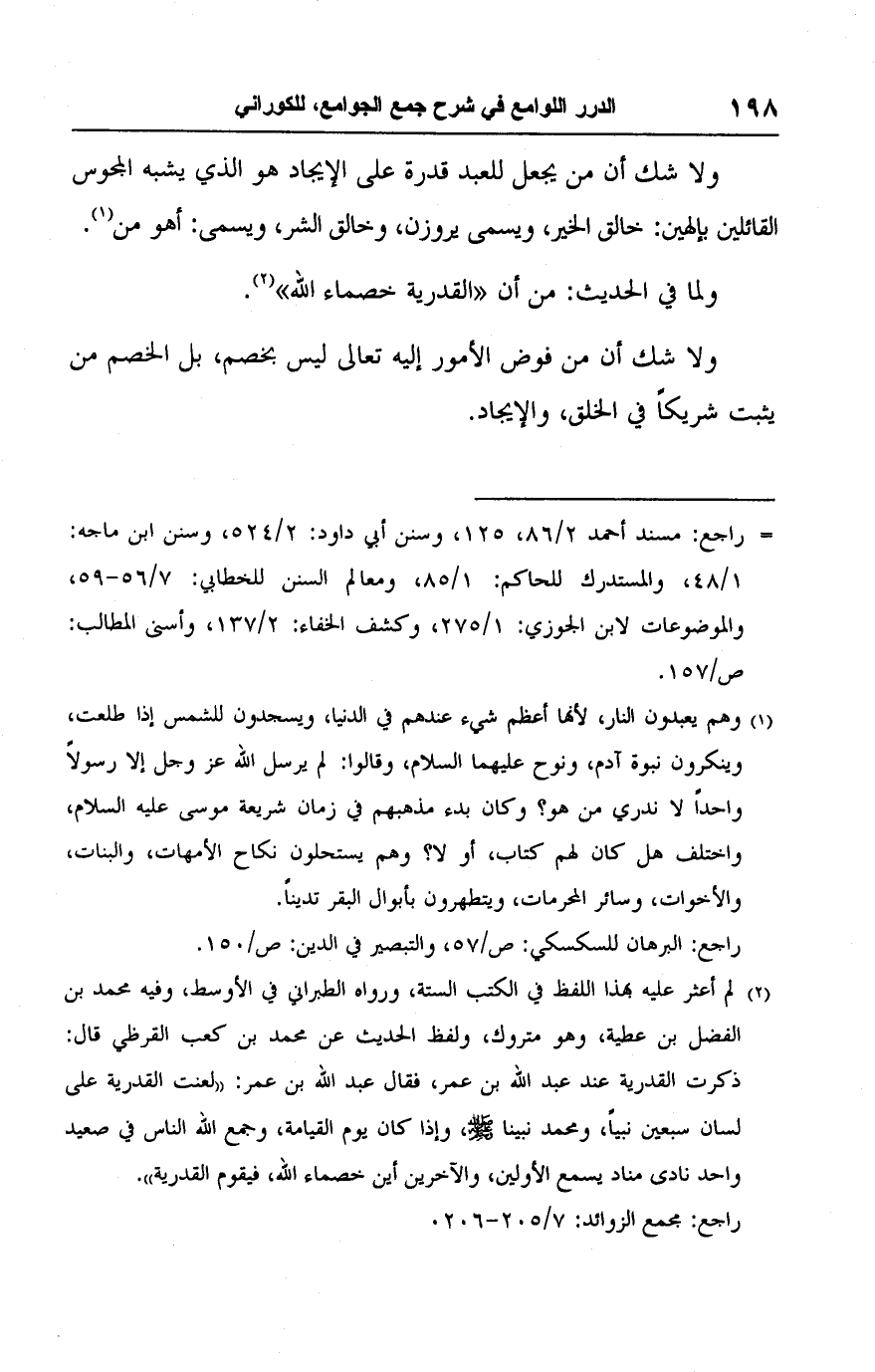 ولا شك أن من يجعل للعبد قدرة على الإيجاد هو الذي يشبه المجوس القائلين بإلهين: خالق الخير، ويسمى يروزن، وخالق الشر، ويسمى: أهو من (١).