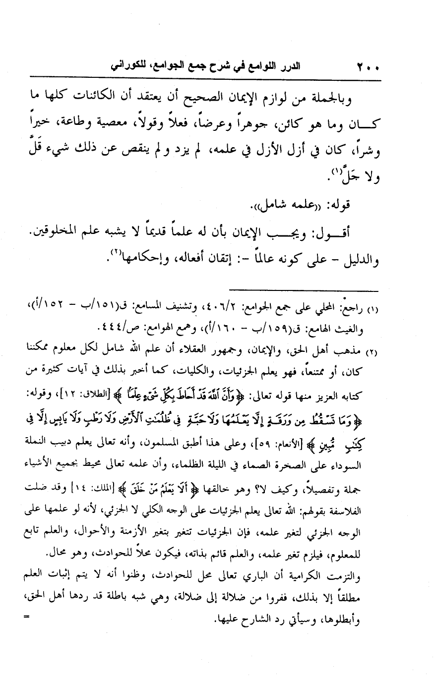 (٢) مذهب أهل الحق، والإيمان، وجمهور العقلاء أن علم اللَّه شامل لكل معلوم ممكننا كان، أو ممتنعًا، فهو لِعلم الجزئيات، والكليات، كما أخبر بذلك في آيات كثيرة من كتابه العزيز منها قوله تعالى: {وَأَنَّ اللَّهَ قَدْ أَحَاطَ بِكُلِّ شَيْءٍ عِلْمًا} [الطلاق: ١٢]، وقوله: {وَمَا تَسْقُطُ مِنْ وَرَقَةٍ إِلَّا يَعْلَمُهَا وَلَا حَبَّةٍ فِي ظُلُمَاتِ الْأَرْضِ وَلَا رَطْبٍ وَلَا يَابِسٍ إِلَّا فِي كِتَابٍ مُبِينٍ} [الأنعام: ٥٩]، وعلى هذا أطبق المسلمون، وأنه تعالى يعلم دبيب النملة السوداء على الصخرة الصماء في الليلة الظلماء، وأن علمه تعالى محيط بجميع الأشياء جملة وتفصيلًا، وكيف لا؟ وهو خالقها {أَلَا يَعْلَمُ مَنْ خَلَقَ} [الملك: ١٤] وقد ضلت الفلاسفة بقولهم: اللَّه تعالى يعلم الجزئيات على الوجه الكلي لا الجزئي، لأنه لو علمها على الوجه الجزئي لتغير علمه، فإن الجزئيات تتغير بتغير الأزمنة والأحوال، والعلم تابع للمعلوم، فيلزم تغير علمه، والعلم قائم بذاته، فيكون محلًا للحوادث، وهو محال.