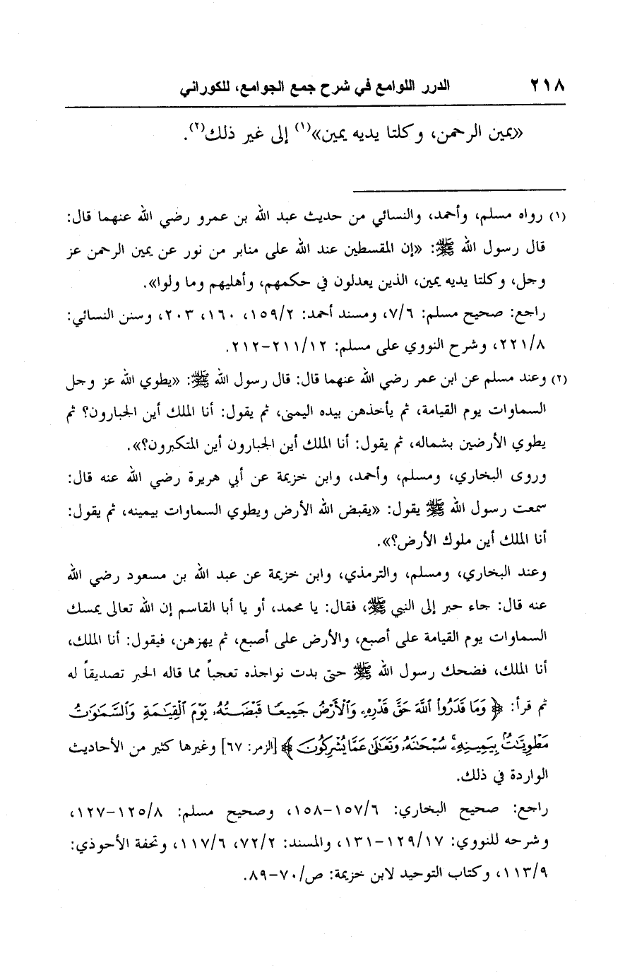 وعند البخاري، ومسلم، والترمذي، وابن خزيمة عن عبد اللَّه بن مسعود رضي اللَّه عنه قال: جاء حبر إلى النبي -صلى اللَّه عليه وسلم-، فقال: يا محمد، أو يا أبا القاسم إن اللَّه تعالى يمسك السماوات يوم القيامة على أصبع، والأرض على أصبع، ثم يهزهن، فيقول: أنا الملك، أنا الملك، فضحك رسول اللَّه -صلى اللَّه عليه وسلم- حتى بدت نواجذه تعجبًا مما قاله الحبر تصديقًا له ثم قرأ: {وَمَا قَدَرُوا اللَّهَ حَقَّ قَدْرِهِ وَالْأَرْضُ جَمِيعًا قَبْضَتُهُ يَوْمَ الْقِيَامَةِ وَالسَّمَاوَاتُ مَطْوِيَّاتٌ بِيَمِينِهِ سُبْحَانَهُ وَتَعَالَى عَمَّا يُشْرِكُونَ} [الزمر: ٦٧] وغيرها كثير من الأحاديث الواردة في ذلك.