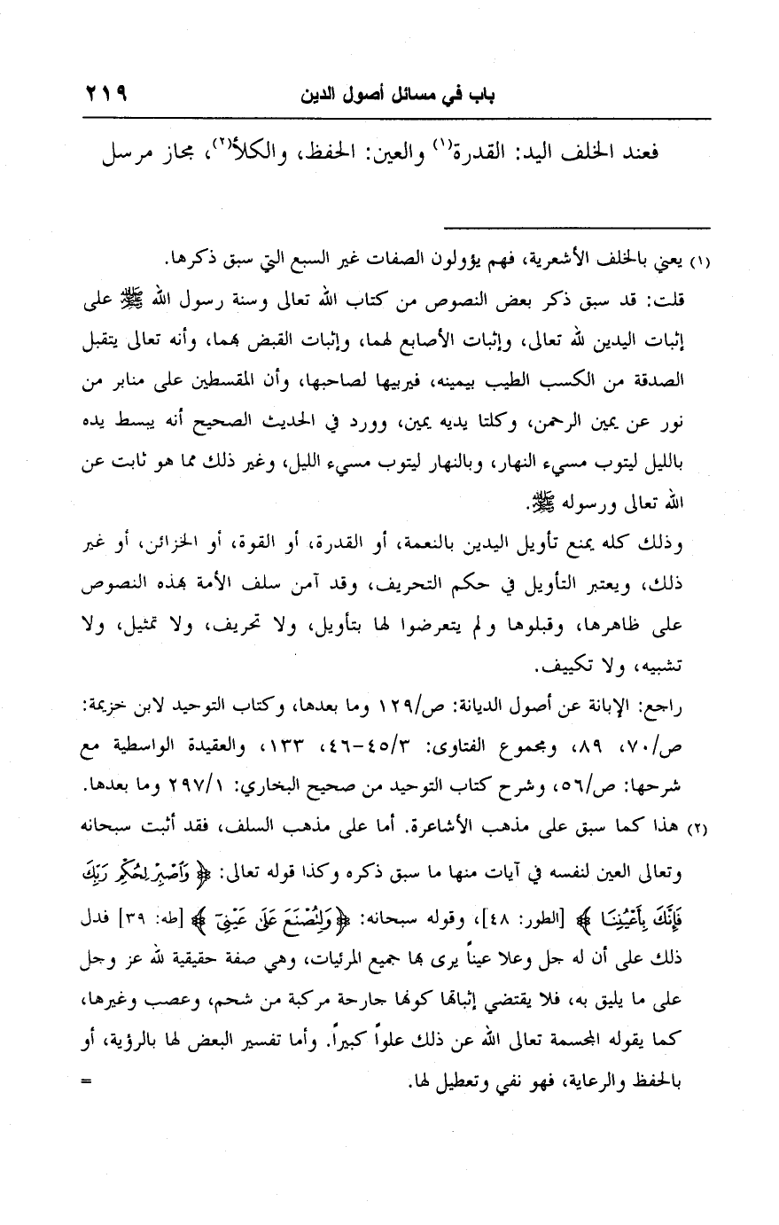 راجع: الإبانة عن أصول الديانة: ص/ ١٢٩ وما بعدها، وكتاب التوحيد لابن خزيمة: ص/ ٧٠، ٨٩، ومجموع الفتاوى: ٣/ ٤٥ - ٤٦، ١٣٣، والعقيدة الواسطية مع شرحها: ص/ ٥٦، وشرح كتاب التوحيد من صحيح البخاري: ١/ ٢٩٧ وما بعدها.