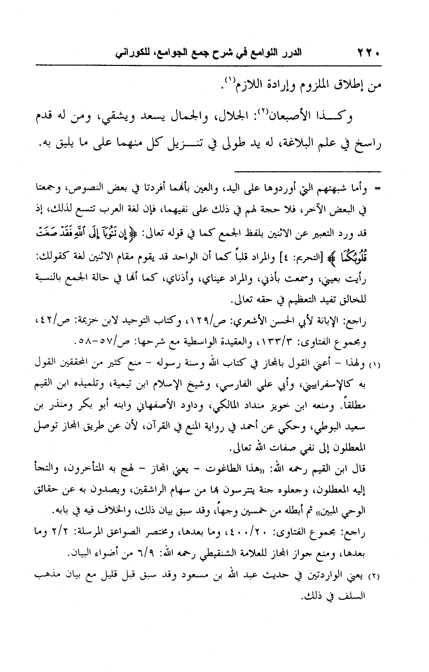 راجع: مجموع الفتاوى: ٢٠/ ٤٠٠، وما بعدها، ومختصر الصواعق المرسلة: ٢/ ٢ وما بعدها، ومنع جواز المجاز للعلامة الشنقيطي رحمه اللَّه: ٩/ ٦ من أضواء البيان.