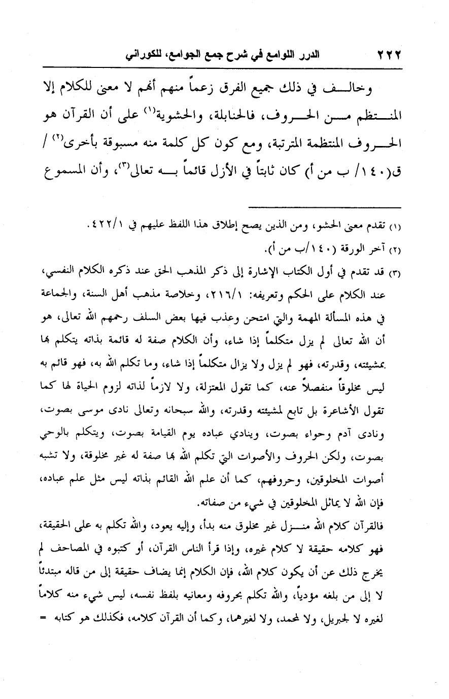 (٣) قد تقدم في أول الكتاب الإشارة إلى ذكر المذهب الحق عند ذكره الكلام النفسي، عند الكلام على الحكم وتعريفه: ١/ ٢١٦، وخلاصة مذهب أهل السنة، والجماعة في هذه المسألة المهمة والتي امتحن وعذب فيها بعض السلف رحمهم اللَّه تعالى، هو أن اللَّه تعالى لم يزل متكلمًا إذا شاء، وأن الكلام صفة له قائمة بذاته يتكلم بها بمشيئته، وقدرته، فهو لم يزل ولا يزال متكلمًا إذا شاء، وما تكلم اللَّه به، فهو قائم به ليس مخلوقًا منفصلًا عنه، كما تقول المعتزلة، ولا لازمًا لذاته لزوم الحياة لها كما تقول الأشاعرة بل تابع لمشيئته وقدرته، واللَّه سبحانه وتعالى نادى موسى بصوت، ونادى آدم وحواء بصوت، وينادي عباده يوم القيامة بصوت، ويتكلم بالوحي بصوت، ولكن الحروف والأصوات التي تكلم اللَّه بها صفة له غير مخلوقة، ولا تشبه أصوات المخلوقين، وحروفهم، كما أن علم اللَّه القائم بذاته ليس مثل علم عباده، فإن اللَّه لا يماثل المخلوقين في شيء من صفاته.