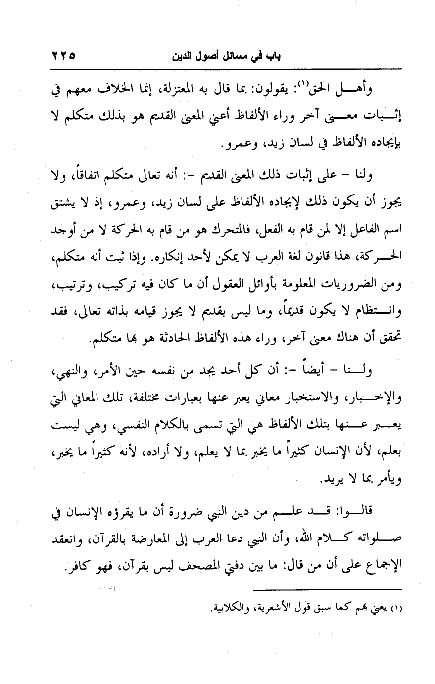 ولنا -على إثبات ذلك المعنى القديم-: أنه تعالى متكلم اتفاقًا، ولا يجوز أن يكون ذلك لإيجاده الألفاظ على لسان زيد، وعمرو، إذ لا يشتق اسم الفاعل إلا من قام به الفعل، فالمتحرك هو من قام به الحركة لا من أوجد الحركة، هذا قانون لغة العرب لا يمكن لأحد إنكاره. وإذا ثبت أنه متكلم، ومن الضروريات المعلومة بأوائل العقول أن ما كان فيه تركيب، وترتيب، وانتظام لا يكون قديمًا، وما ليس بقديم لا يجوز قيامه بذاته تعالى، فقد تحقق أن هناك معنى آخر، وراء هذه الألفاظ الحادثة هو بها متكلم.