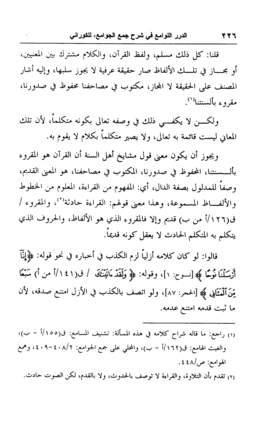 ويجوز أن يكون معنى قول مشايخ أهل السنة أن القرآن هو المقروء بألسنتنا، المحفوظ في صدورنا، المكتوب في مصاحفنا، هو المعنى القديم، وصفًا للمدلول بصفة الدال، أي: المفهوم من القراءة، المعلوم من الخطوط والألفاظ المسموعة، وهذا معنى قولهم: القراءة حادثة (٢)، والمقروء قديم وإلا فالمقروء الذي هو الألفاظ، والحروف الذي يتكلم به المتكلم الحادث لا يعقل كونه قديمًا.