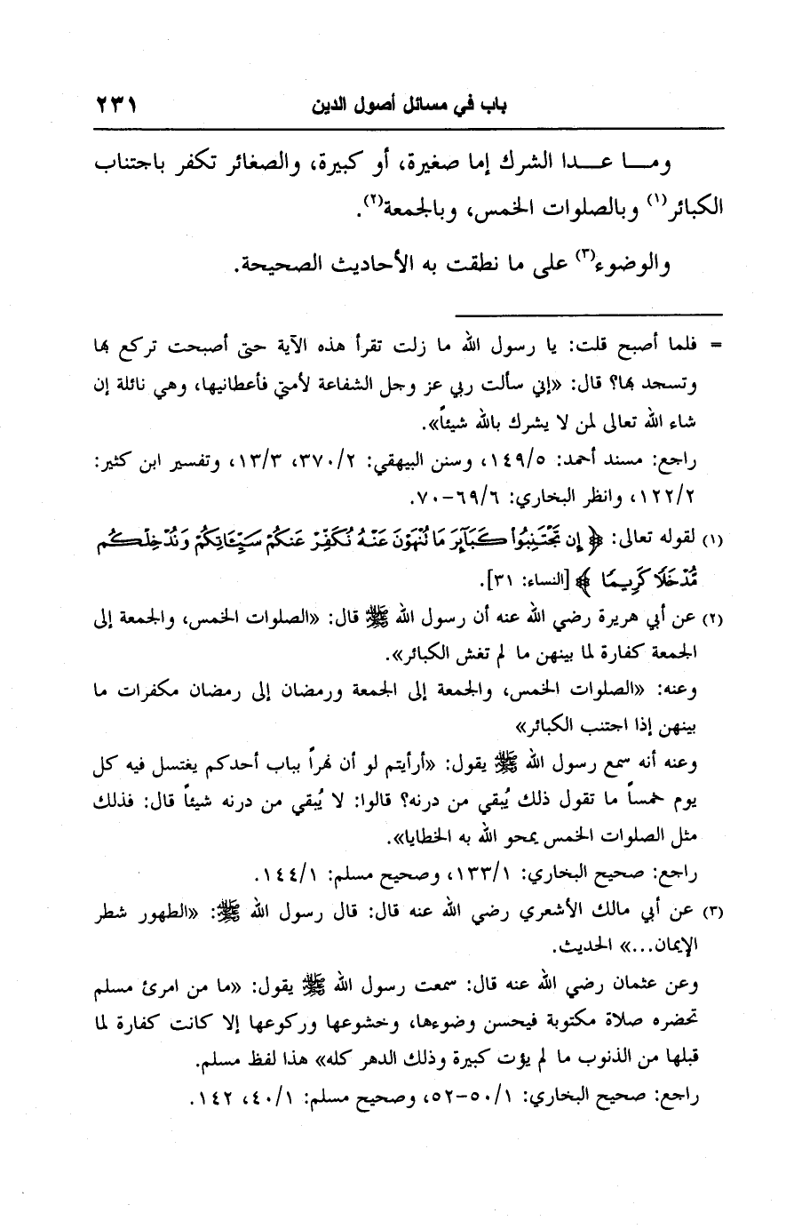 (١) لقوله تعالى: {إِنْ تَجْتَنِبُوا كَبَائِرَ مَا تُنْهَوْنَ عَنْهُ نُكَفِّرْ عَنْكُمْ سَيِّئَاتِكُمْ وَنُدْخِلْكُمْ مُدْخَلًا كَرِيمًا} [النساء: ٣١].